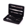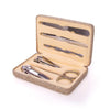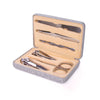 Hard shell case 6 piece nail and beauty set: stainless steel tweezers, cuticle pusher, scissors, nail file and two nail clippers.