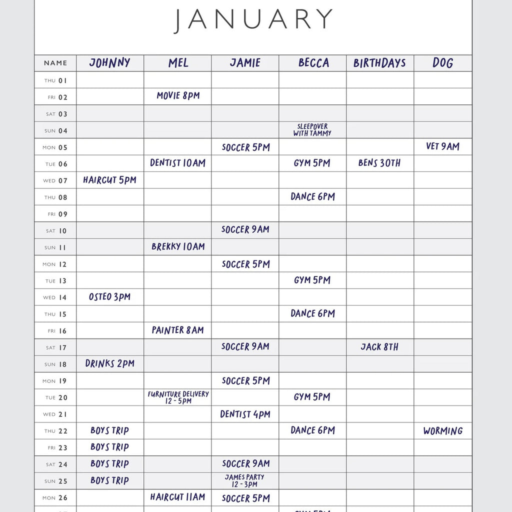 Pro tip: assign each person a different colour for a quick visual guide, hang it somewhere everyone can see, and give it a quick update daily. You’ll avoid double bookings, stop the “wait, who’s doing what?” confusion, and keep the whole family literally on the same page.