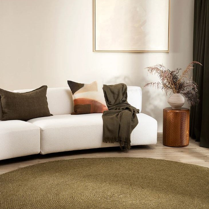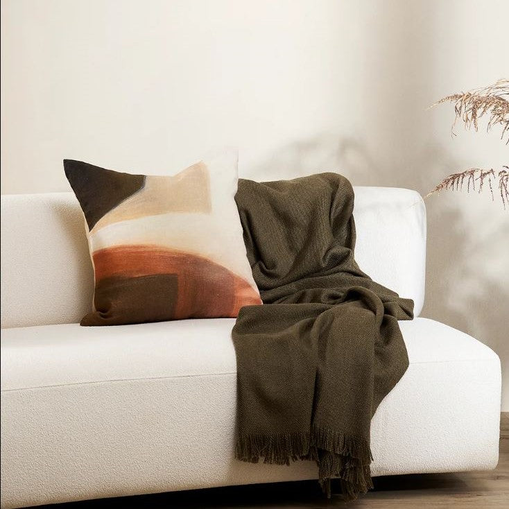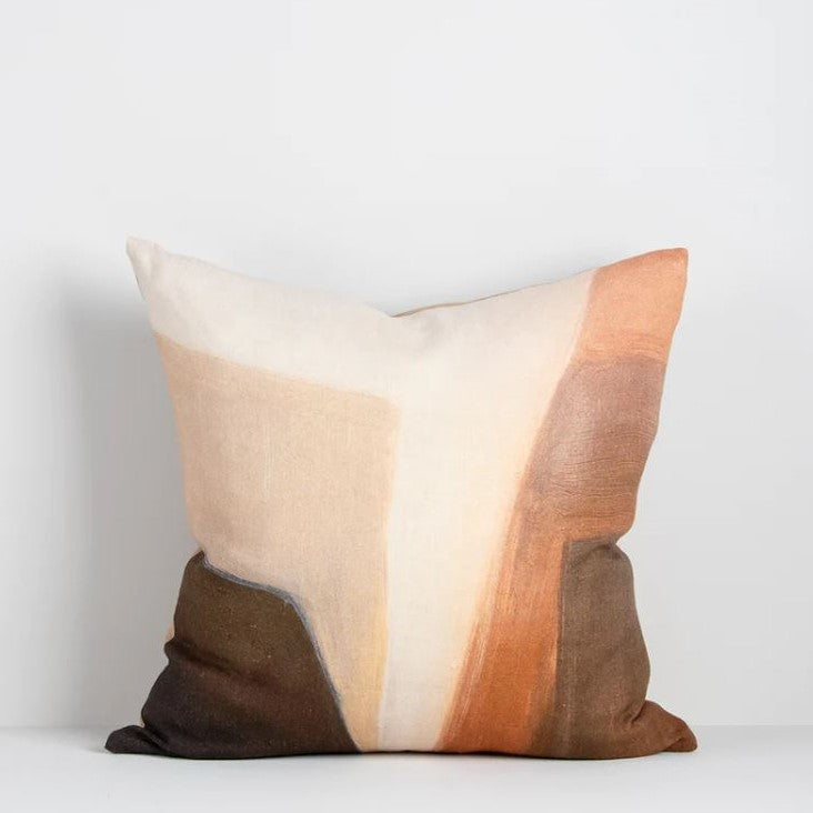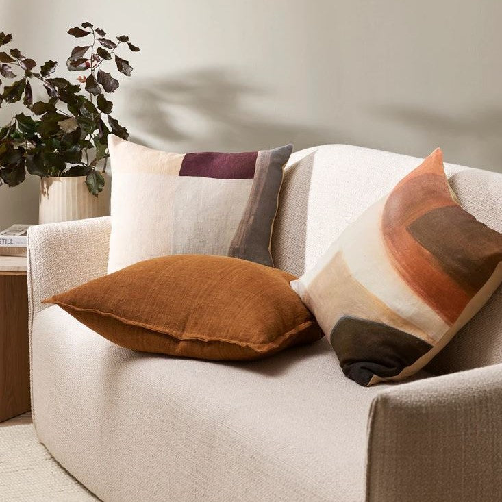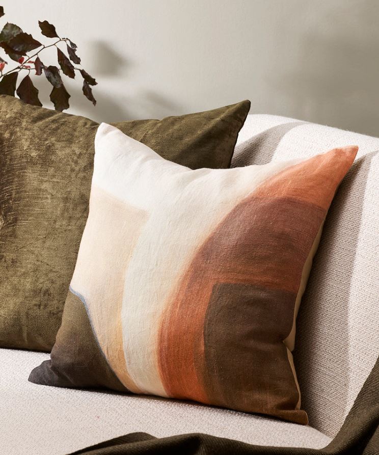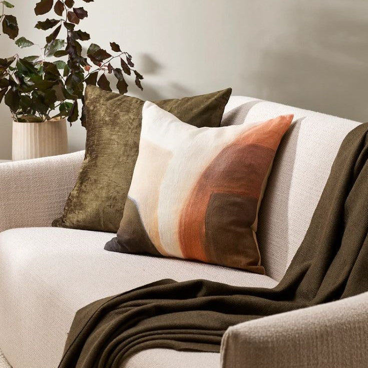 Abstract shapes are captured with quiet elegance in this raw yet sophisticated cushion. Designed to inspire and enrich the spaces surrounding you, rich autumnal tones are expressed in visible brushstrokes to create a refined and timeless aesthetic. Style with finely woven linens, textured neutrals, and richly toned throws.