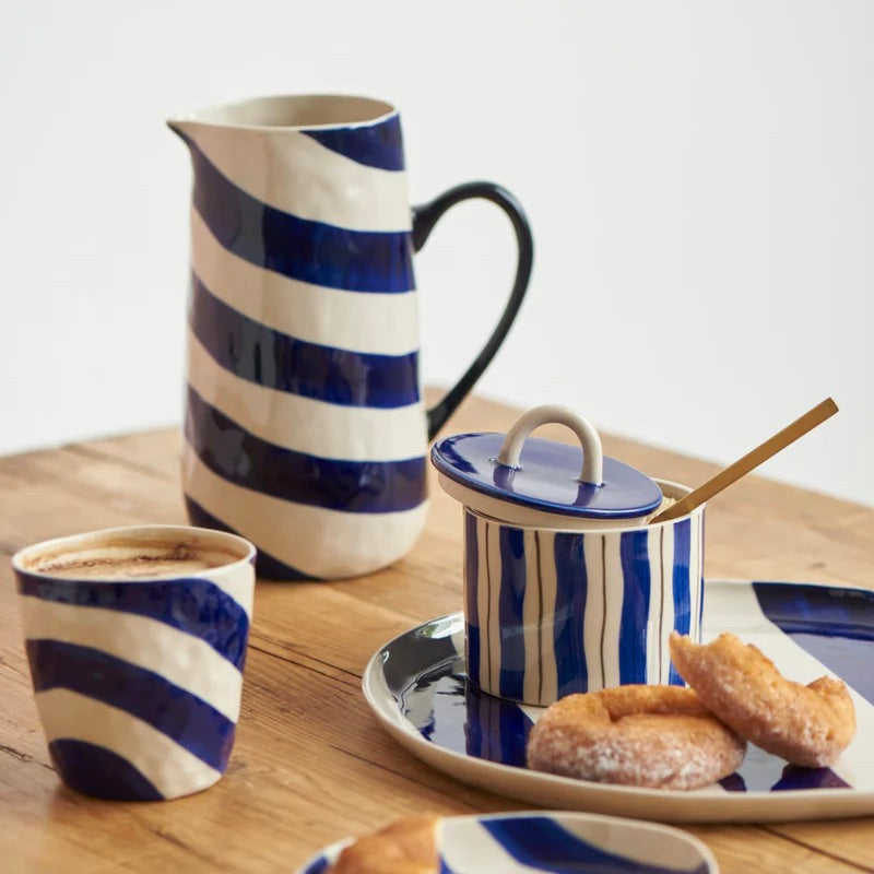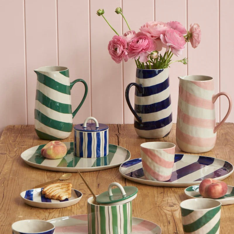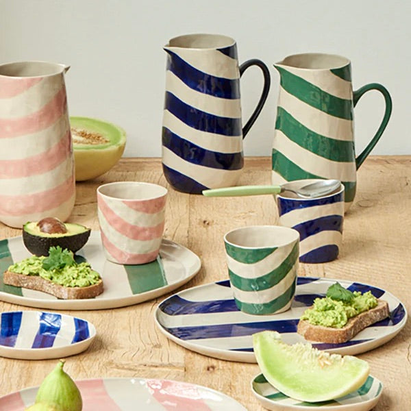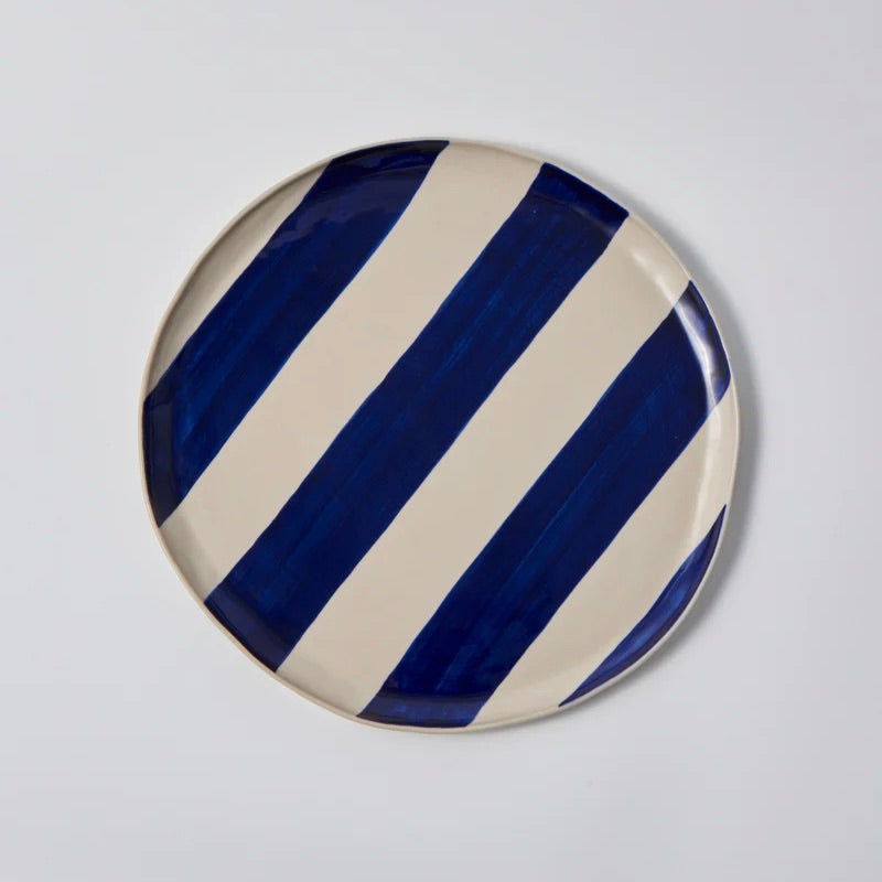 Introducing our versatile Cabana Stripe Platters! Crafted from natural earthenware clay and hand-painted with thick and bold stripes, these platters are designed to elevate your dining experience and more. Their irregular and organically shaped design adds a unique touch to your space, making them perfect for serving, wall display, or keeping things organized on your dresser or in the bathroom. The Cabana pattern, a fresh and modern take on classic stripes, injects fun style and a hint of drama into your home.