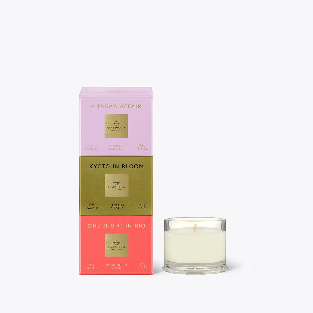 Includes 3 x 30g Soy Candles: A Tahaa Affair Vanilla Caramel, Kyoto In Bloom Camellia & Lotus, One Night In Rio Passionfruit & Lime.