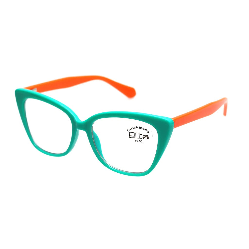 Eva is fun and daring. Oversized and bright. Featuring blue light blocking lenses, light weight frame and spring hinges for a perfect, comfortable fit.