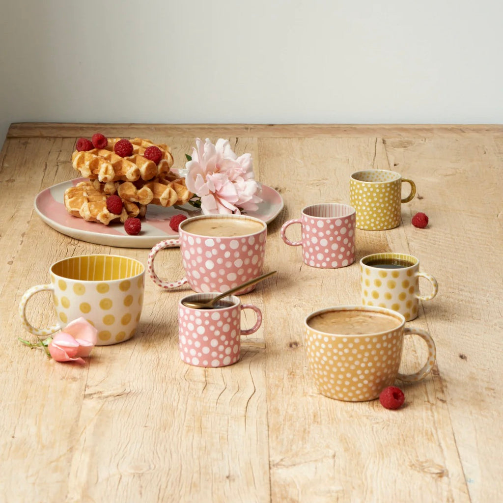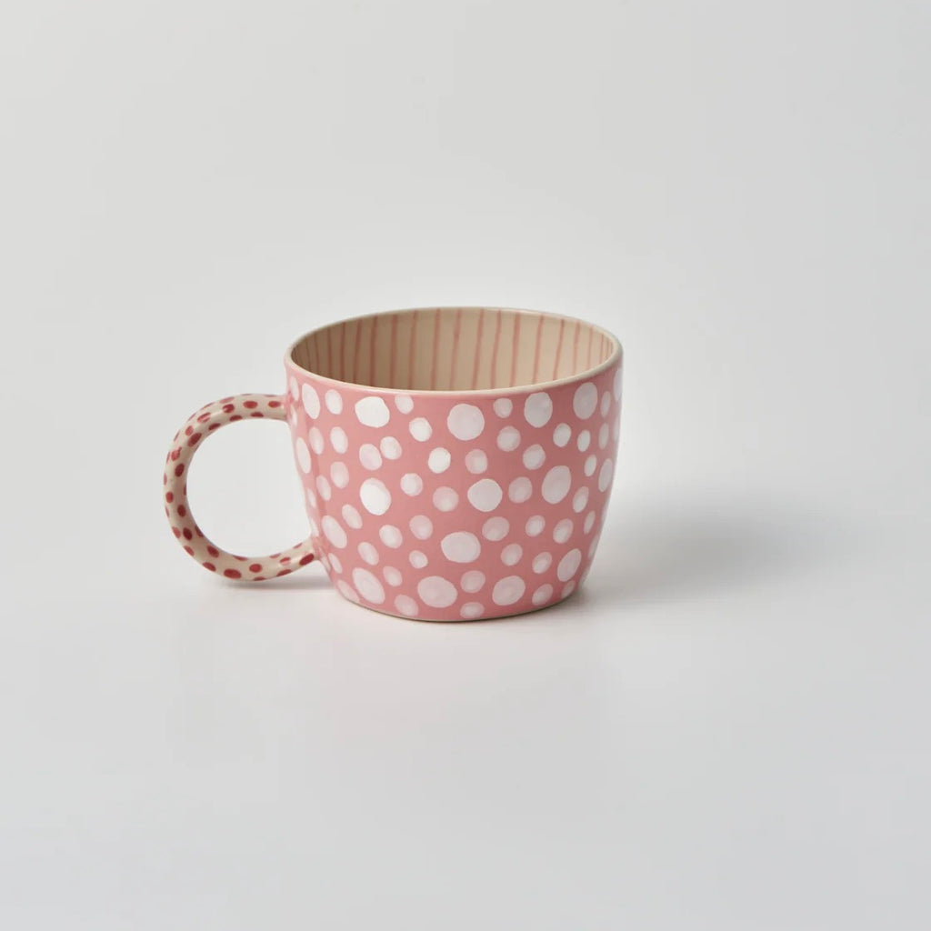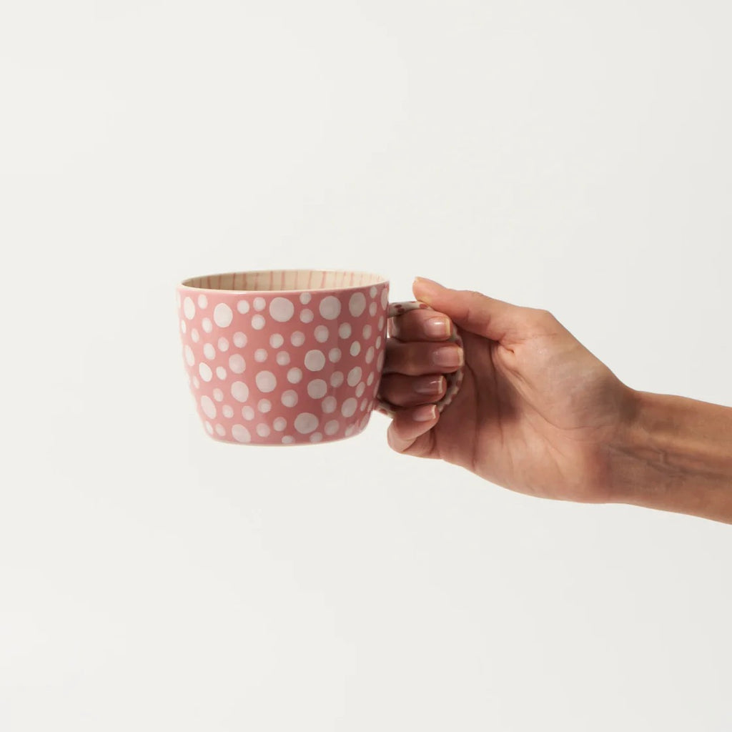 This Chino mug Pink Dot is sculpted from earthenware clay, sporting a pretty dusty pink shade, adorned with whimsical spots. Designed in the same beloved shape as our best-selling original Chino mugs, it brings a big dash of charm to your coffee moments. Elevate your daily routine with this delightful mug, stack them on display in your kitchen as they are far to pretty to keep behind closed doors.