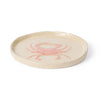 Natural organic-shaped plate with hand-painted pink dimensional crab and a glazed finish.