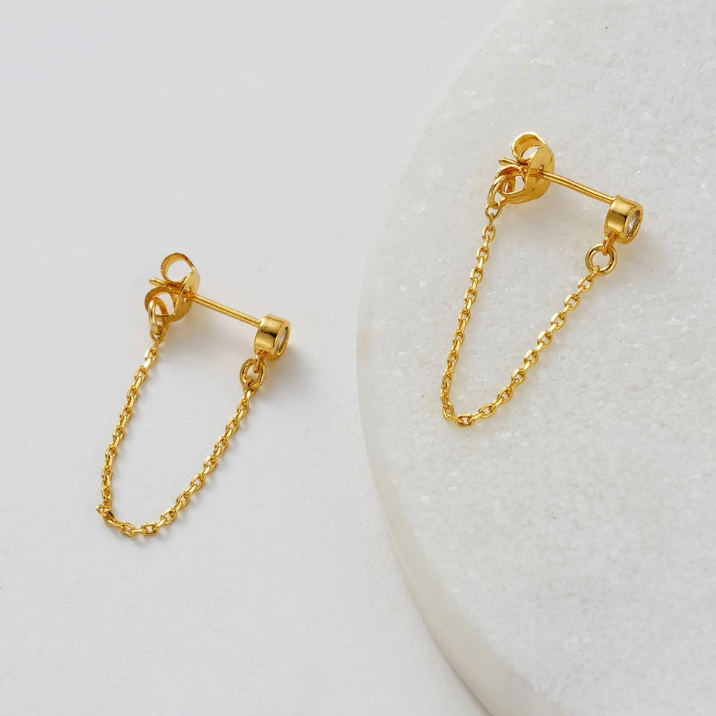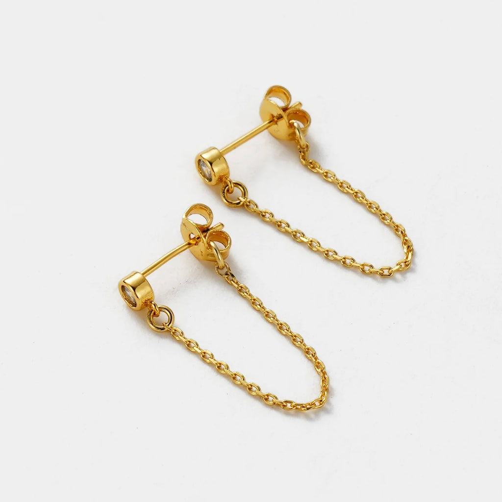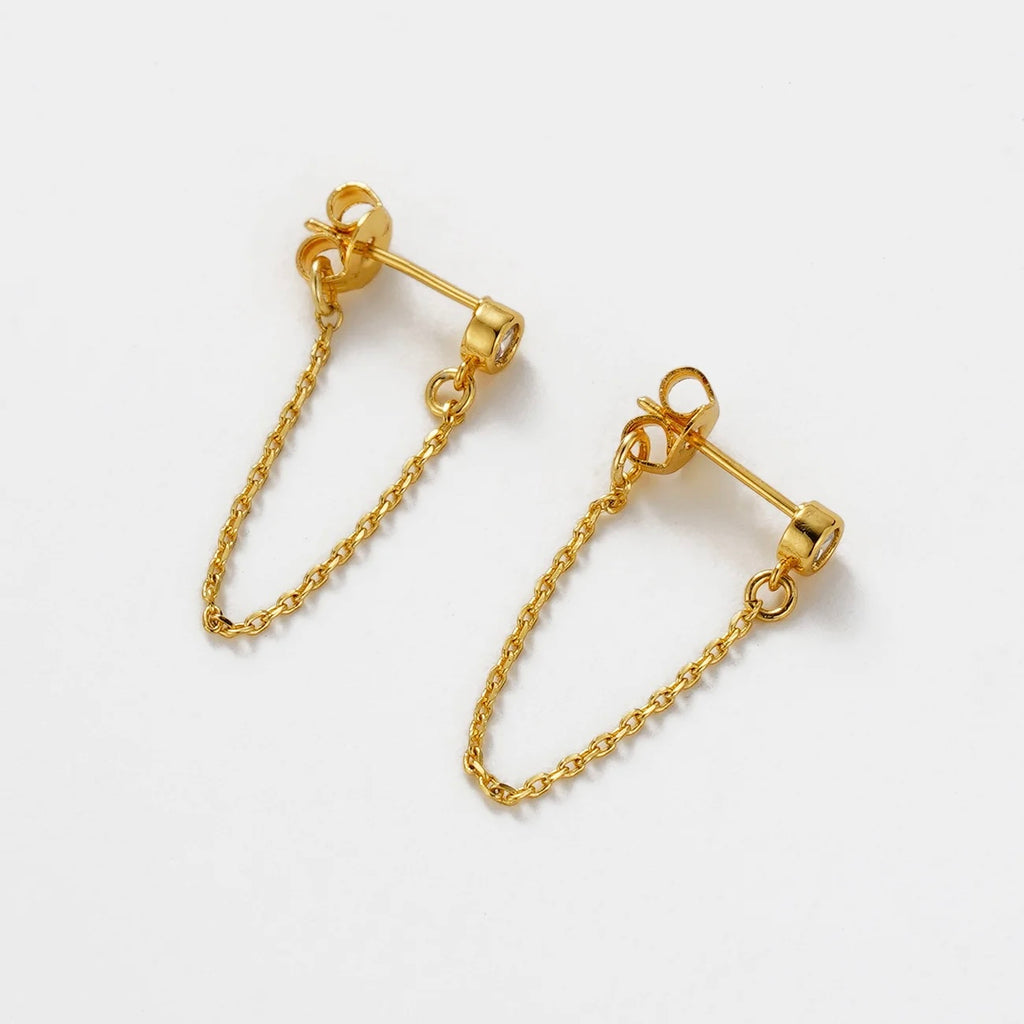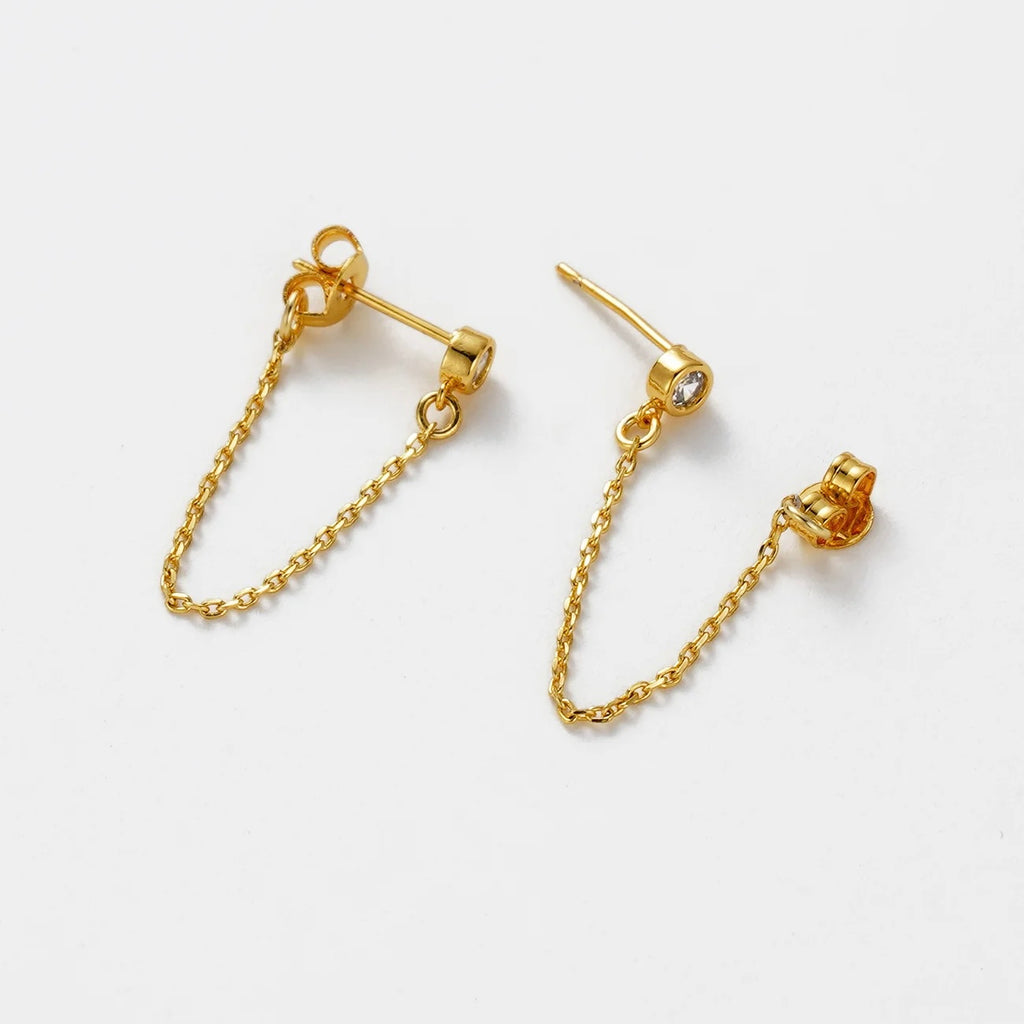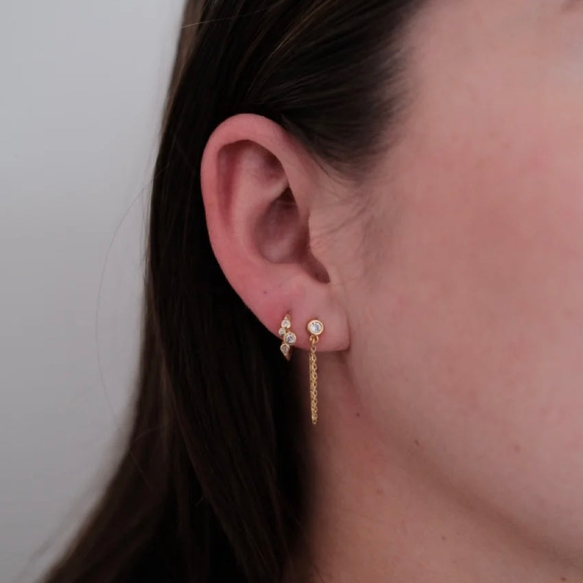 The Crystal Chain Wrap Earring is a modern take on a classic stud. Featuring a sparkling crystal set in a sleek bezel and a delicate gold chain that wraps elegantly around the ear, this style blends subtle sparkle with edgy sophistication. Perfect for layering with other studs or hoops, it’s a versatile piece that transitions effortlessly from day to night.