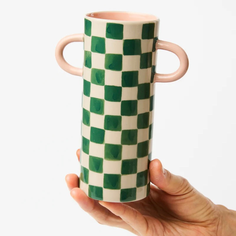 Cream and forest green checkerboards dance across this cylindrical vessel, creating a rhythm of pattern that feels very contemporary. The twin handles, invite interaction, while the hand-painted surface speaks to the artisan's confident brushwork. Perfect for a few sprigs of green or a single stem, this vase transforms even the most modest botanical into a statement.