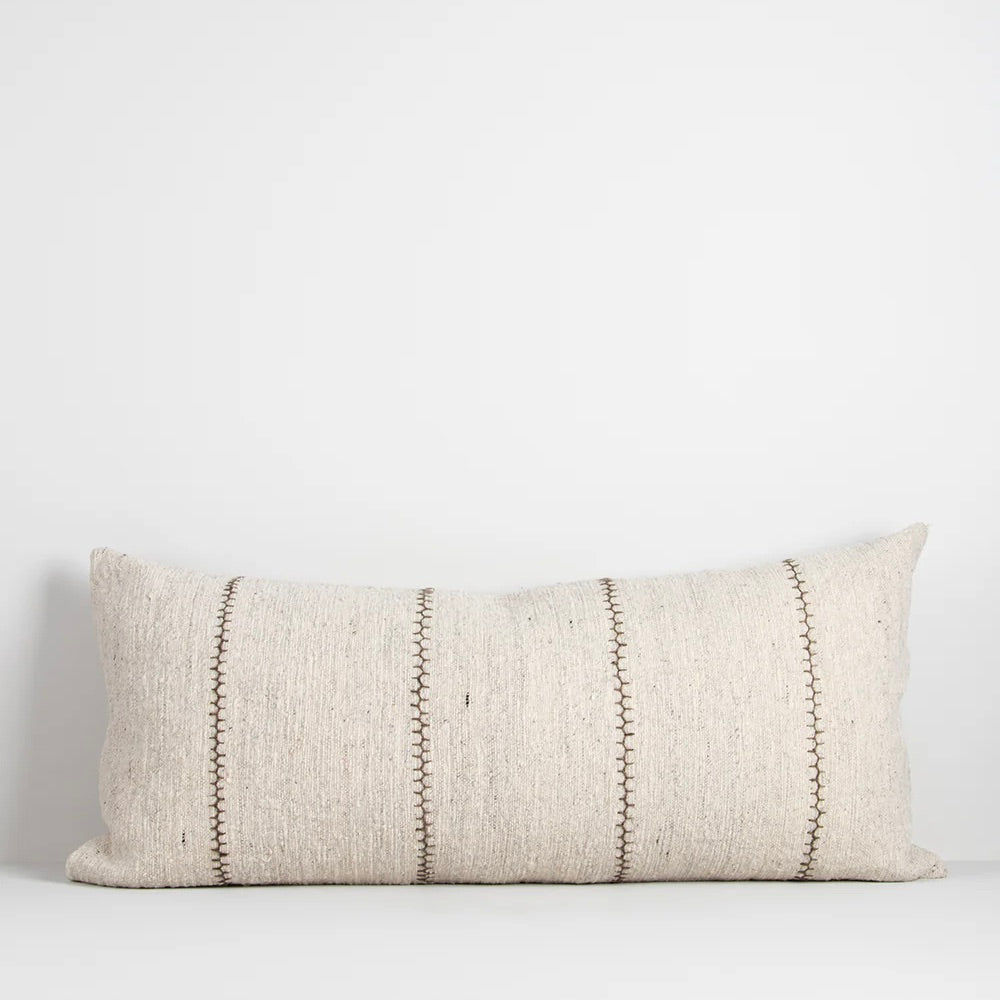 Create a natural, artisan aesthetic with the pared-back design of our Kalahari cushion. Handwoven from thick, textural cotton, a delicate Cretan-stitch is embroidered in khaki over a natural, ecru-toned base. Easy to style, the long, lumbar shape is perfect for bedrooms, where the textural weave and subtle surface detailing create a restful and restorative space. Pair with clean, contrasting accessories and plain weave cushions to highlight the intricacies of the weave.