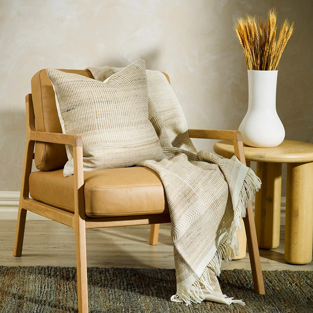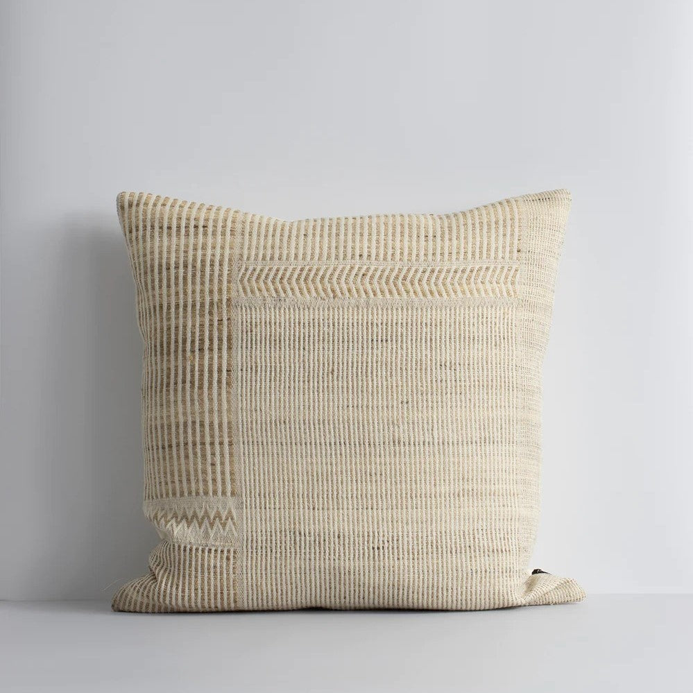 Constructed from sections of artisanal woven fabric, the Navajo is handcrafted using a stunning blend of wild tussar silk and spun wool. Celebrating natural fibres, the straw and ecru tones add a warm and artisan aesthetic to a space. Pair with plain weave cushions to highlight the intricacies of the design.