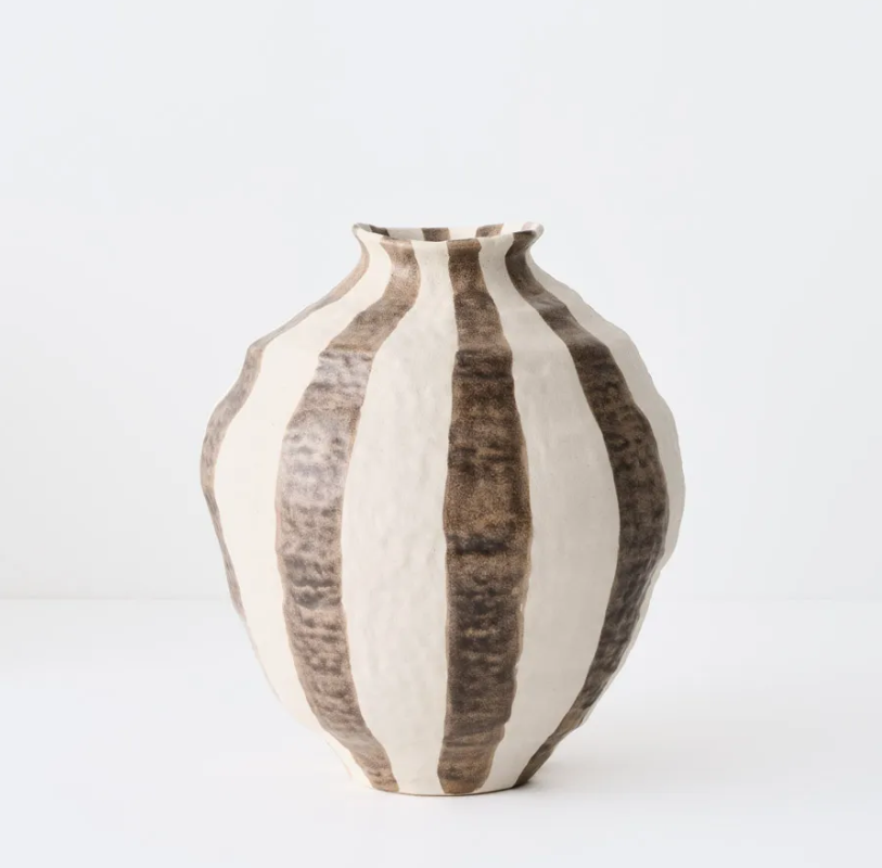 An organically shaped pot featuring sand-toned linear strip details and a beautifully textured finish. A subtle yet striking piece for adding natural warmth and character to any space.