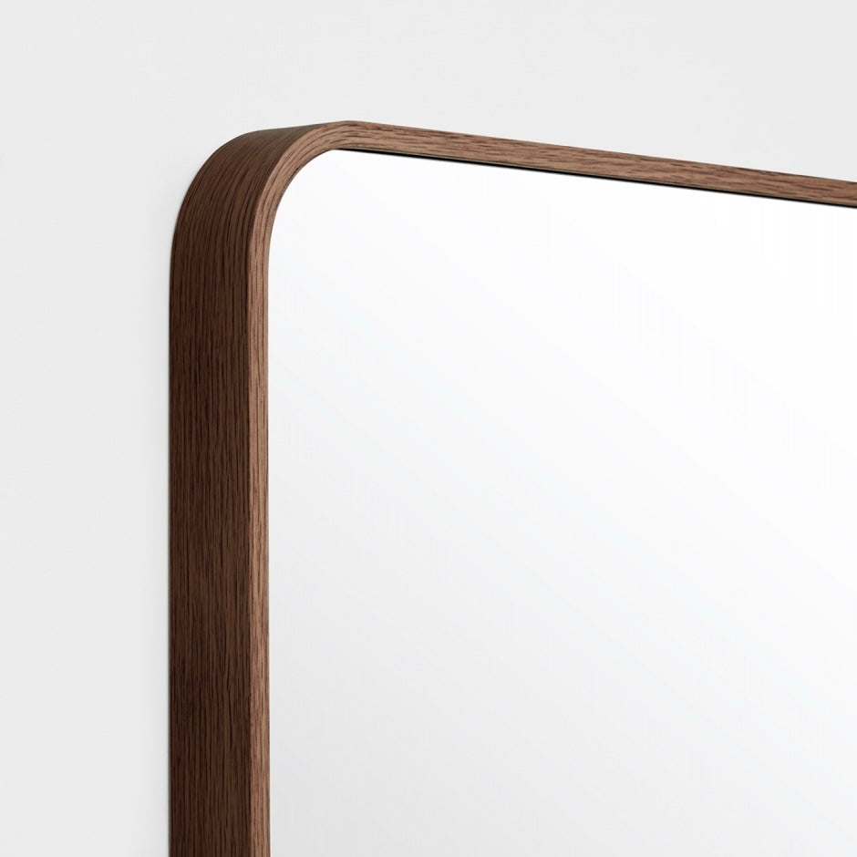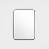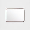 This mirror features a slim metal frame with curved corners and a simple join at the side of the mirror.