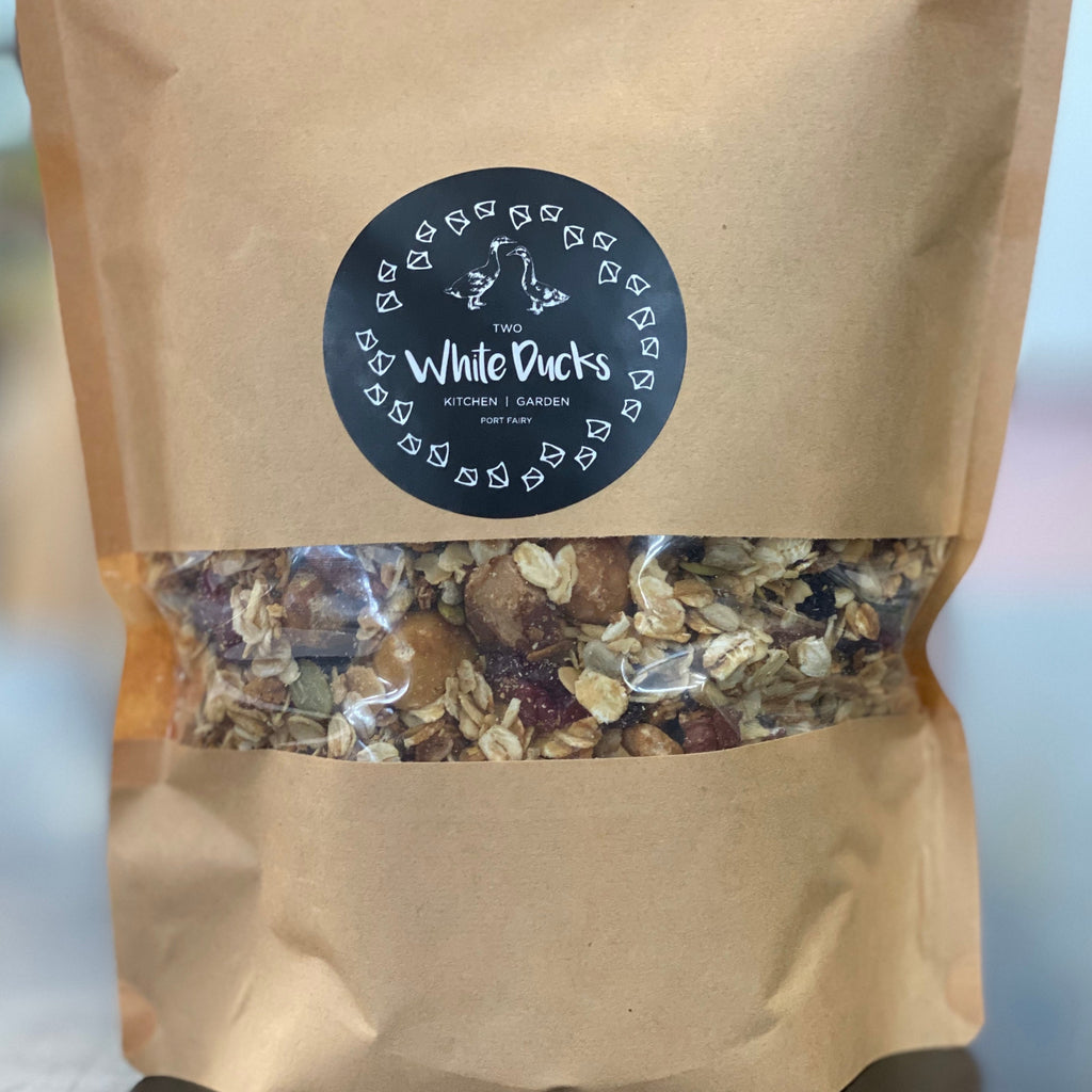 Toasted fruit and nut muesli with just a little crunch.  Hand made in Port Fairy.  Available in 400g jar or 550g bag Ingredients:  Oats, Seeds & Nuts, Coconut, Mixed Fruit, Honey & Coconut Oil