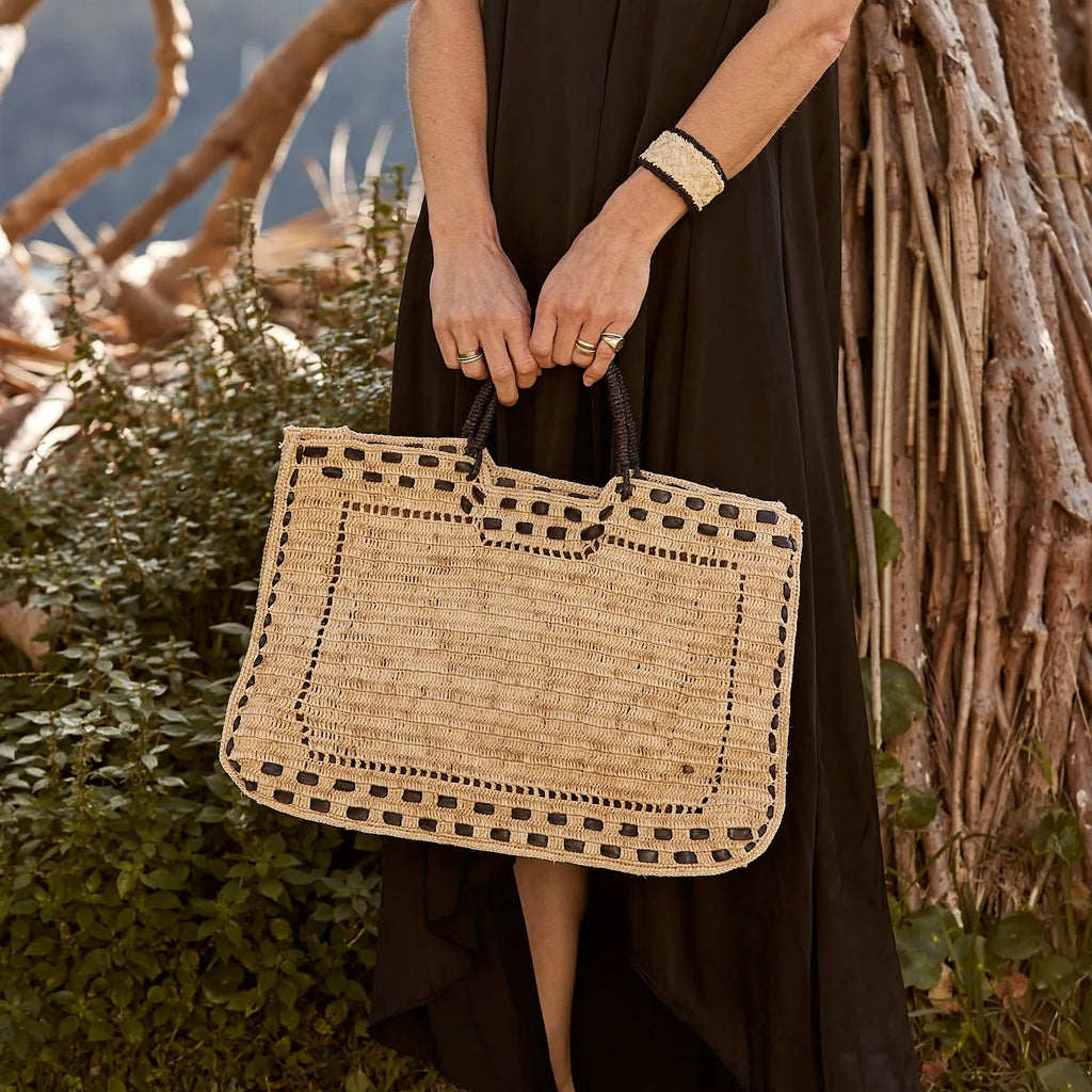 This spacious bag boasts a highly fashionable design, blending leather cords with intricate raffia stitches, a must-have accessory. It includes a generous pocket to securely store your belongings – hand harvested, hand made and woven from durable, sustainably harvested raffia fibres
