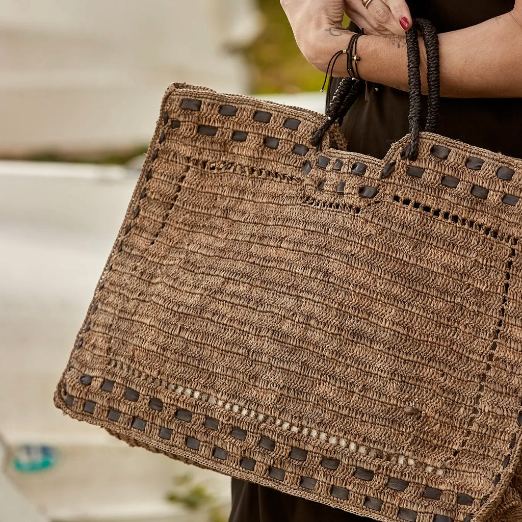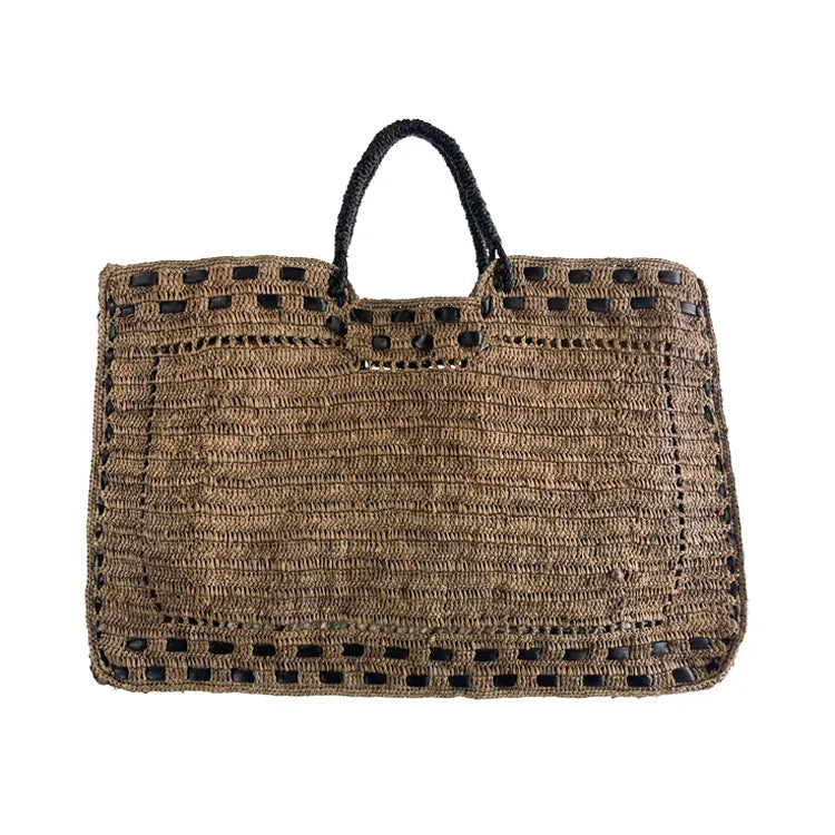 This spacious bag boasts a highly fashionable design, blending leather cords with intricate raffia stitches, a must-have accessory. It includes a generous pocket to securely store your belongings – hand harvested, hand made and woven from durable, sustainably harvested raffia fibres