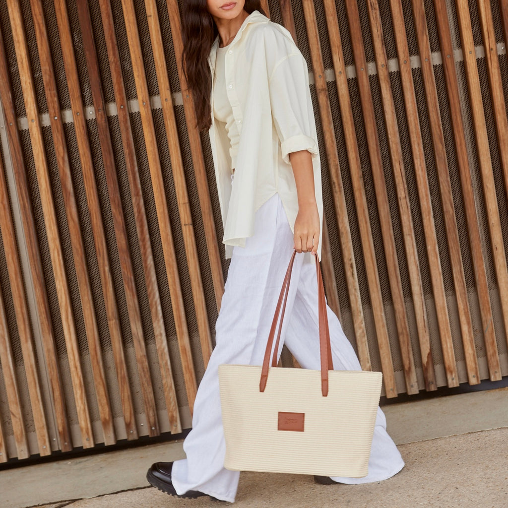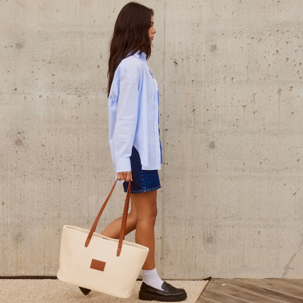A fresh take on the classic basket bag - reimagined with clean lines, a structured silhouette, and elevated trims. Inside, a cotton twill lining keeps things laid-back yet functional, with a roomy single open compartment and a zipped pocket to keep your daily essentials within easy reach, all secured with a magnetic closure.