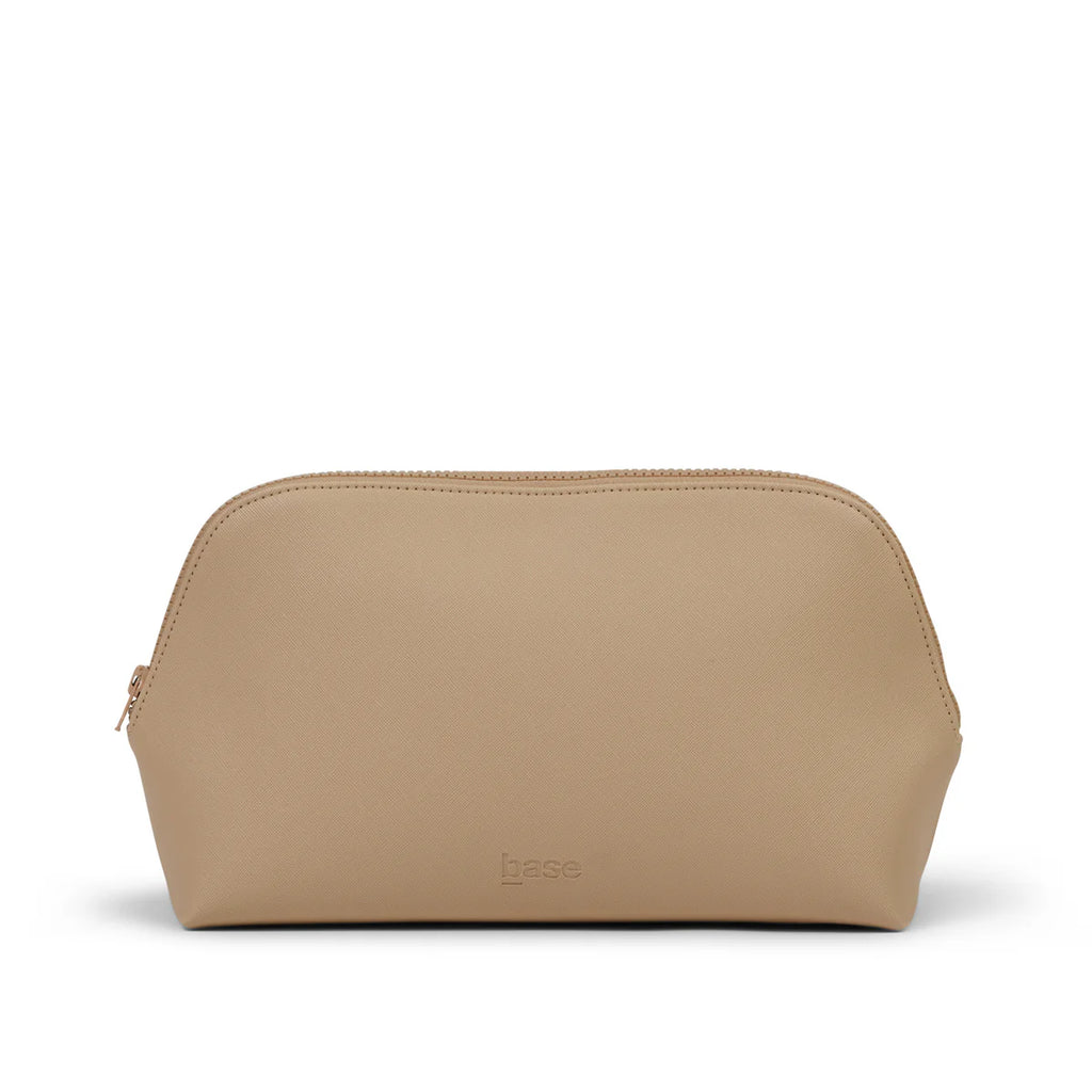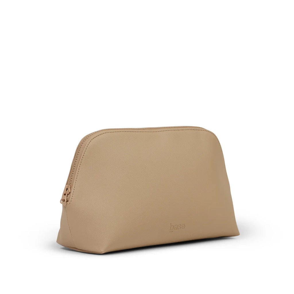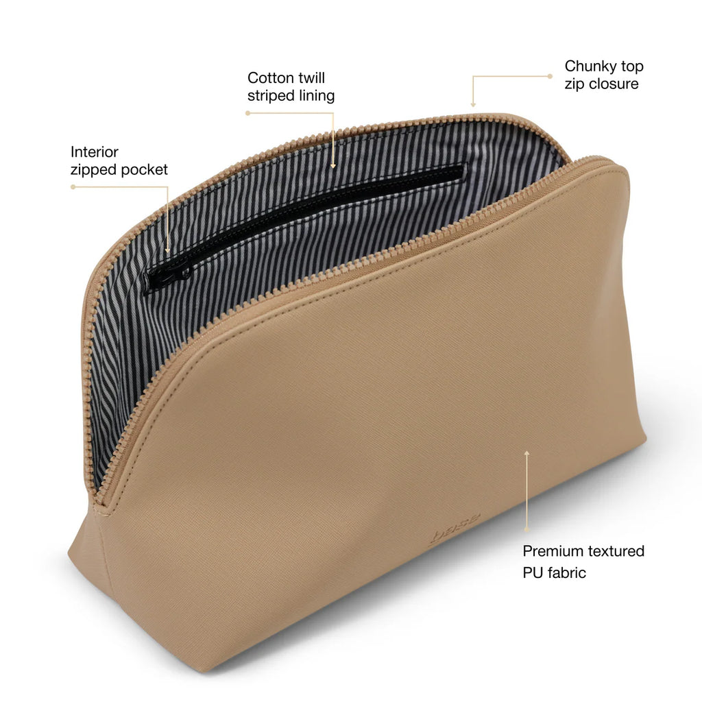 The semi circle shape of our cosmetic base large holds more than the basics. A wide mouth opening with a chunky zip top makes it easy to grab what you need. The interior zip pocket keeps smaller items safe.