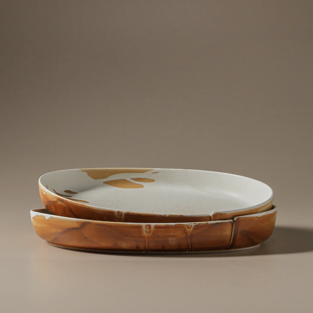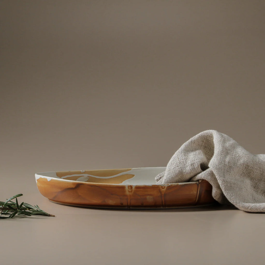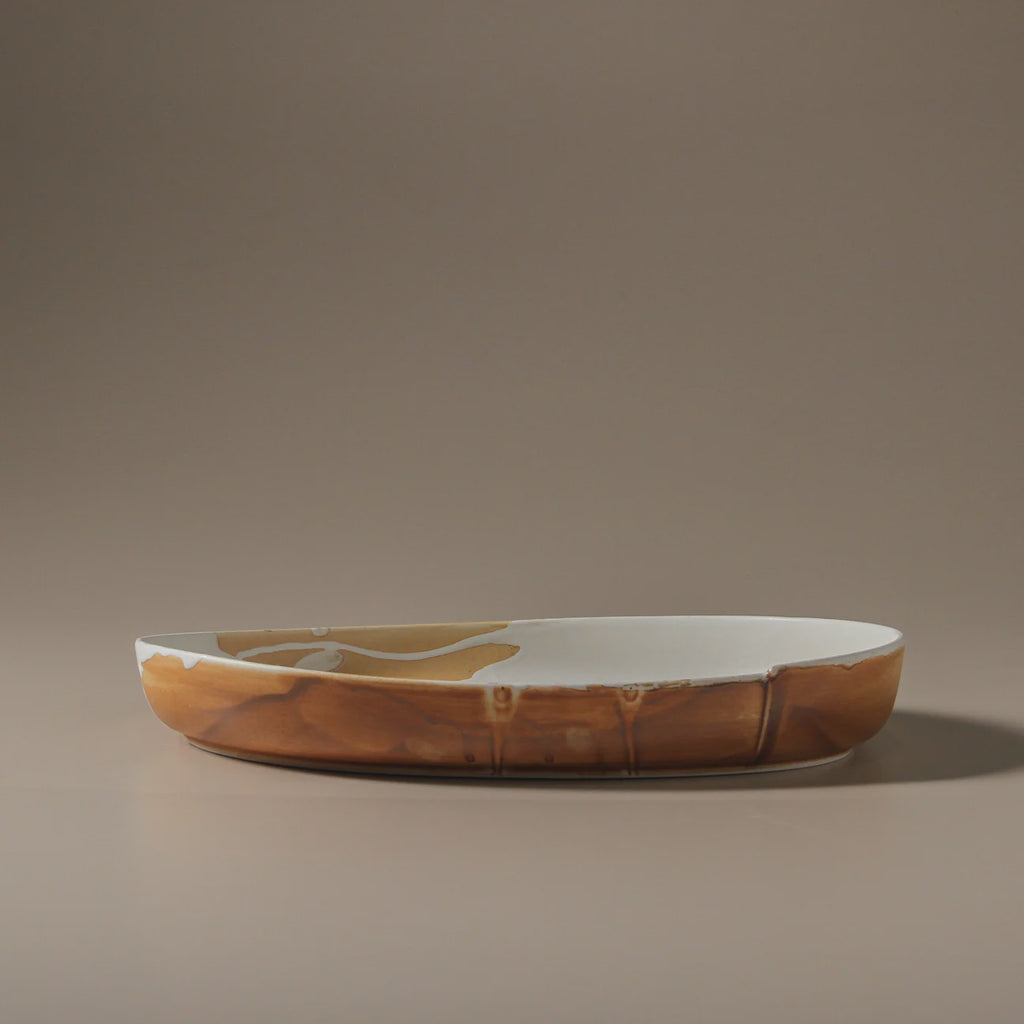 The Kintsu Serving Platter is a canvas of reactive glaze, where earthy wheat tones flow seamlessly across its porcelain surface. Perfect for presenting appetizers, desserts, or shared meals, the platter brings a sense of calm and connection. Its inspiration, drawn from water and earth, aligns with the Sense of Reality collection’s intention to merge art and functionality in interior.