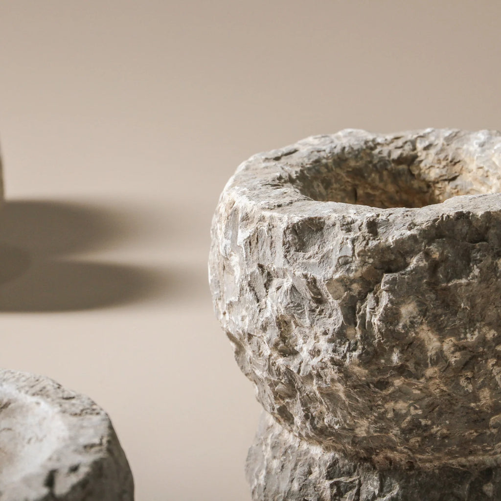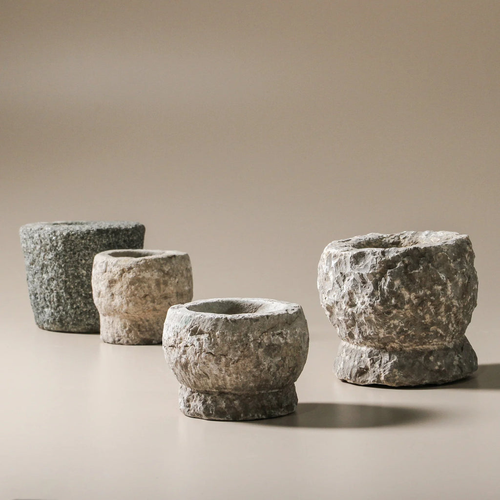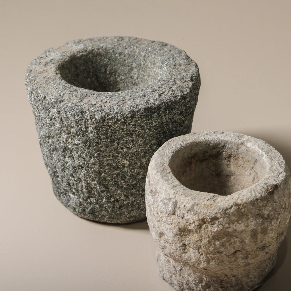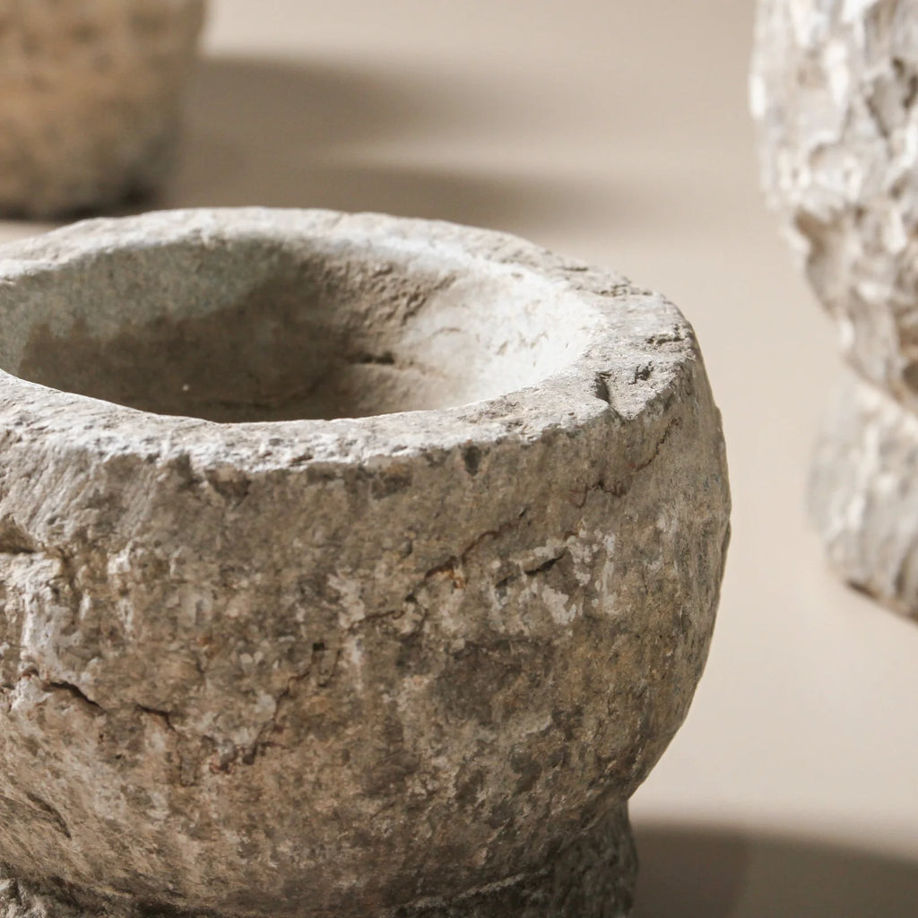 Our vintage find from Shanxi Province, the Chinese Stone Bowl is a beautifully crafted piece that embodies rustic design and historical significance. Carved from stone, each bowl features a weathered exterior and aged patina, showcasing natural variations in texture and tone that speak to its unique origins and materiality.