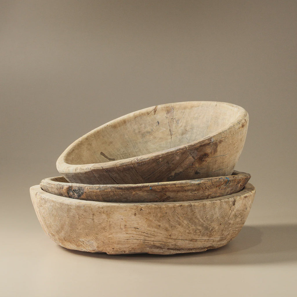 With its soft bleached finish and worn, textural surface, this piece carries the gentle imprint of a life well used. Each one is unique, shaped by time and touch. Today, it brings a sense of grounding to modern interiors — use it to display clustered candles, seasonal fruits, or as a sculptural catch-all on a console or coffee table. A simple, soulful object that adds warmth, character, and quiet beauty to any setting.