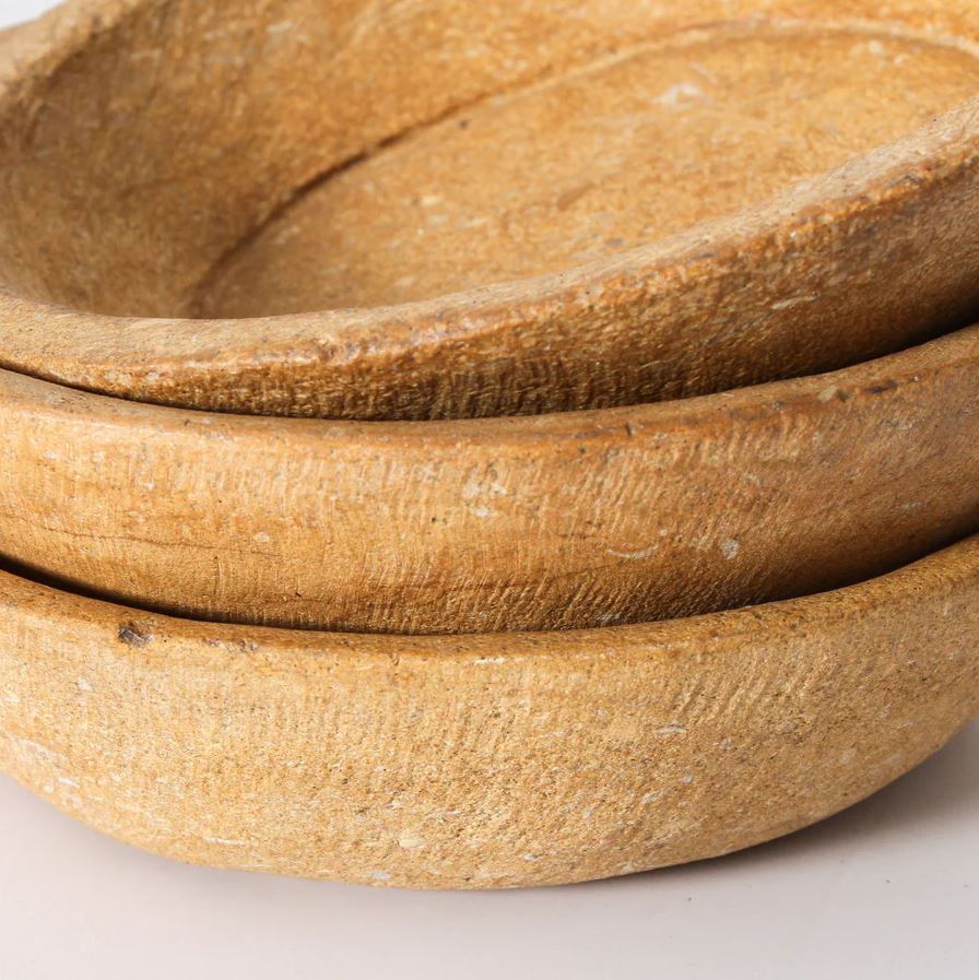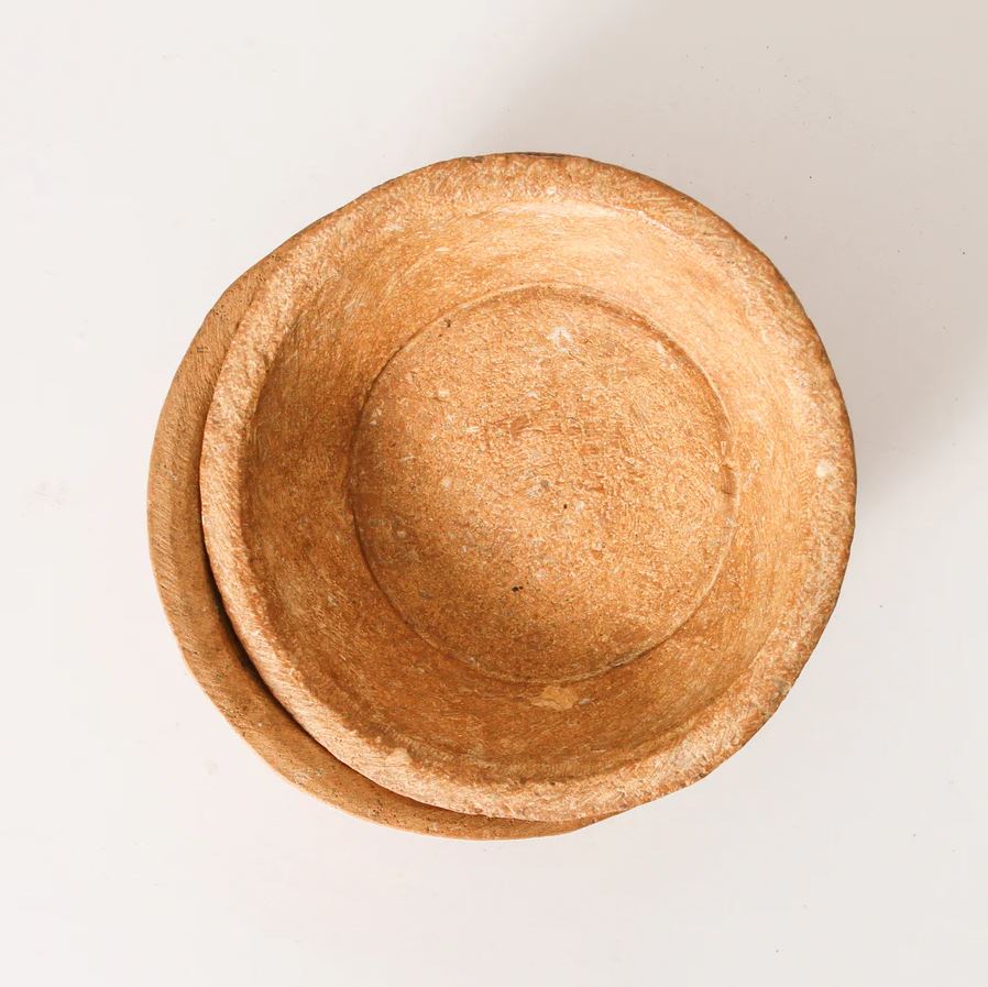 A staple item in northern Indian households, stone bowls and plates like this were used to sort grain or mix flour with fragrant spices and of course, to enjoy home cooked meals. Each is entirely unique and tells the tales of unique families and the meals prepared and shared together. Use this beautiful piece in your living space as a catch all for your essential items or in your bedroom to hold your precious jewellery.