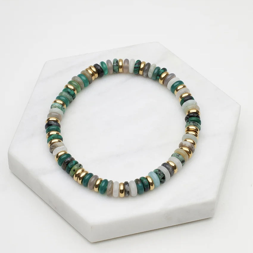 A bold and elegant statement piece, featuring a gradient of olive green-toned beads beautifully contrasted with gold beads. This striking combination creates a rich, sophisticated look, perfect for adding warmth and depth to any jewellery collection.