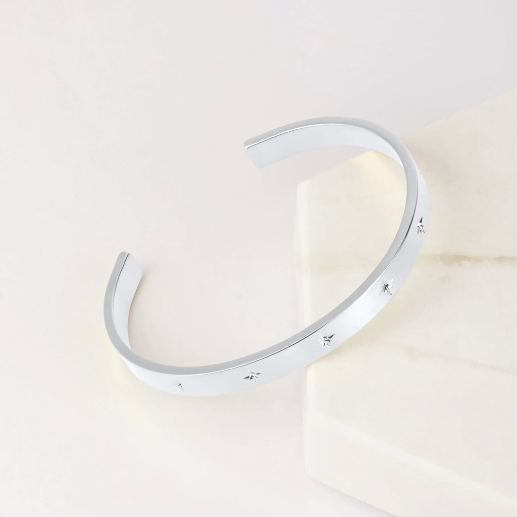 This stunning piece features a sleek and stylish cuff design adorned with star-shaped engravings along the outside. The Layla Bracelet effortlessly combines elegance and mystique, making it a versatile accessory for any occasion. Adorn your wrist with this enchanting bracelet and let its celestial beauty shine through.