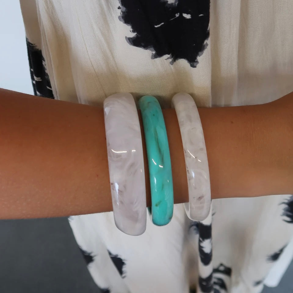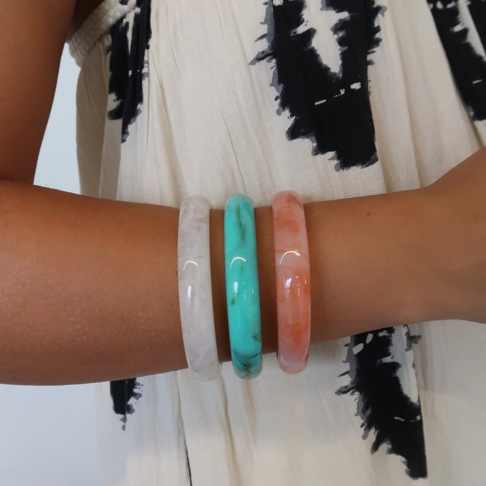 The Leilani Bracelet is a modern masterpiece, featuring a sleek enamel design in a soft cloud white hue. Its clean, minimalist aesthetic makes it a versatile accessory, perfect for elevating any outfit from casual to chic. Whether worn solo for understated elegance or stacked for a bold statement, the Leilani Bracelet is a must-have addition to your jewellery collection.