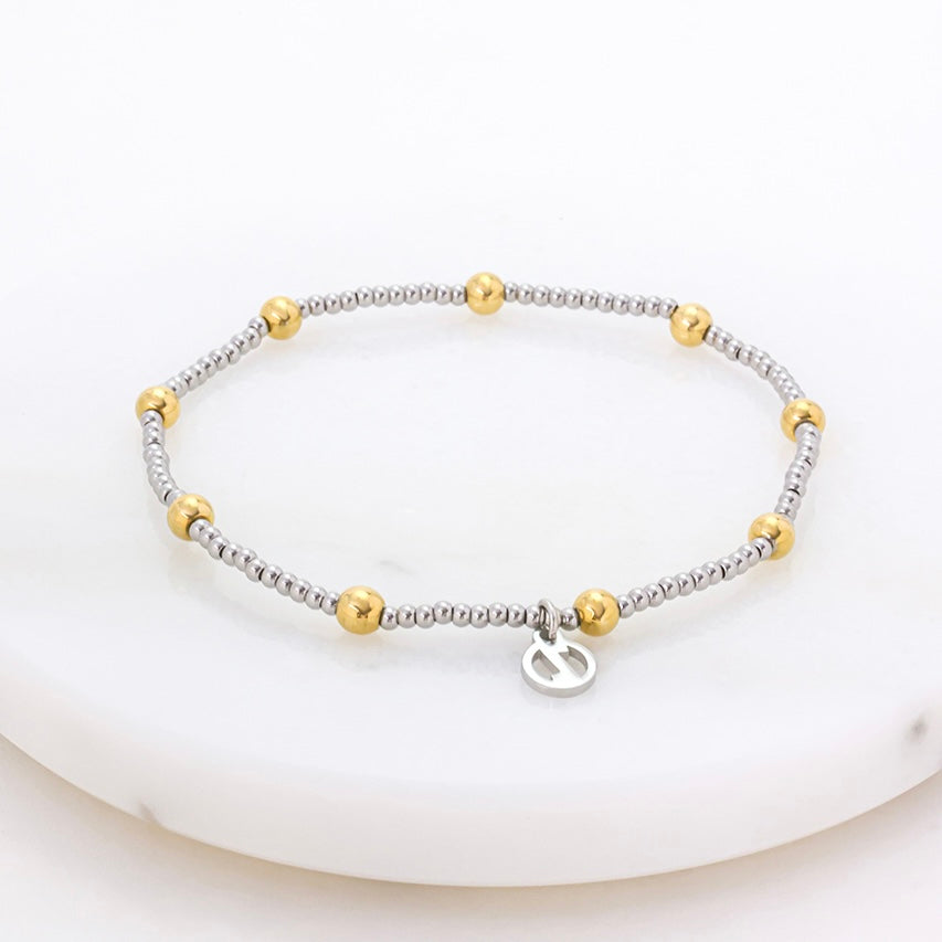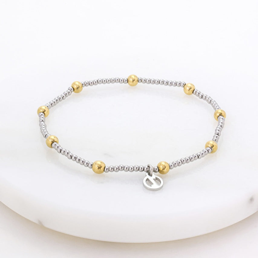 A mixed metal bracelet combining gold and silver accents, finished with freshwater pearls. A versatile piece for effortless layering.