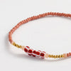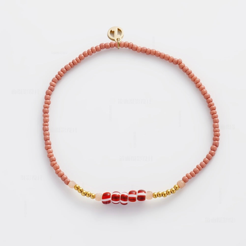 The second bracelet features earthy, terracotta-toned beads accented by vibrant red and white striped focal beads. This slender design is finished with polished gold-tone spacers and a small circular gold charm for a refined, bohemian look.