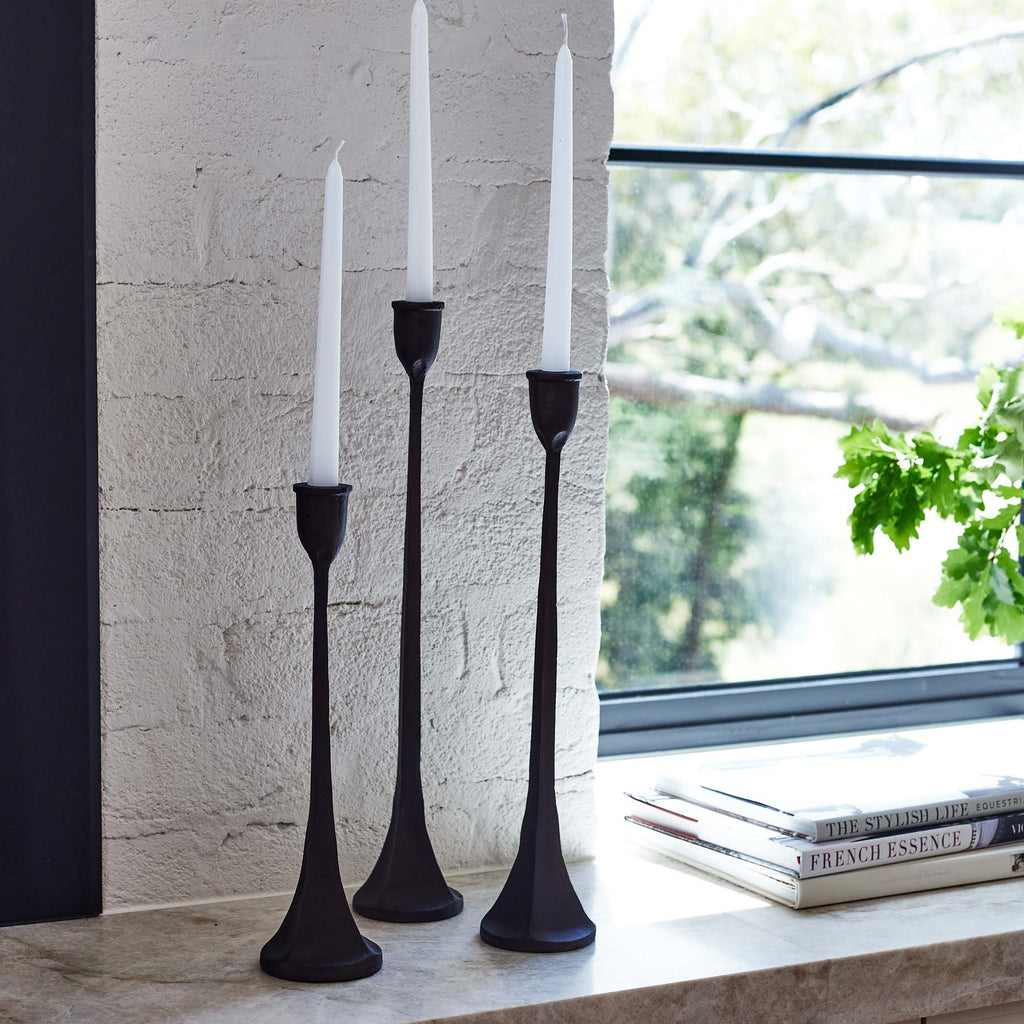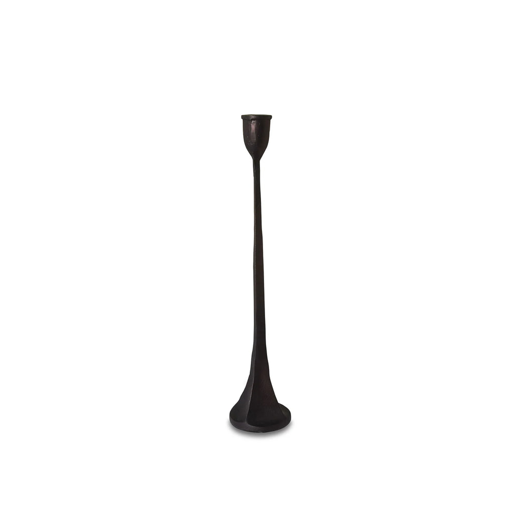Handcrafted by skilled artisans in India, this cast metal candlestick features an aged black finish, radiating an aura of antique charm.