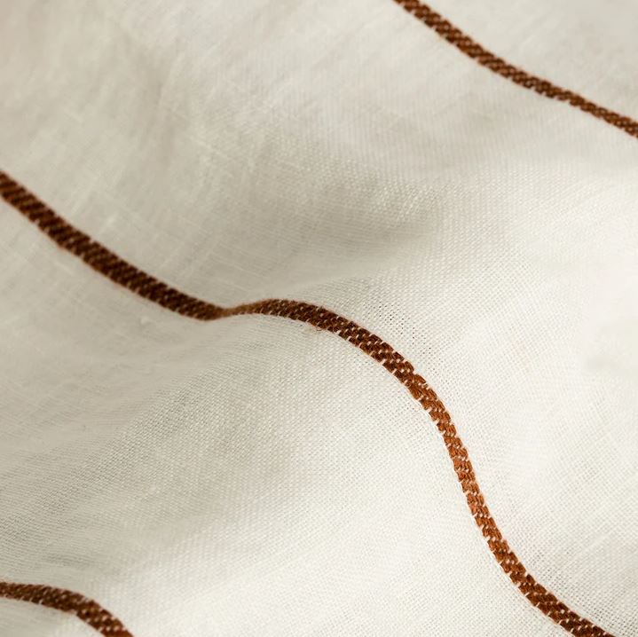 Cedar Stripe features a spaced, textured stripe woven in rich Cedar that runs across a soft off-white linen. Finished with a button closure and internal ties in each corner to secure your insert.