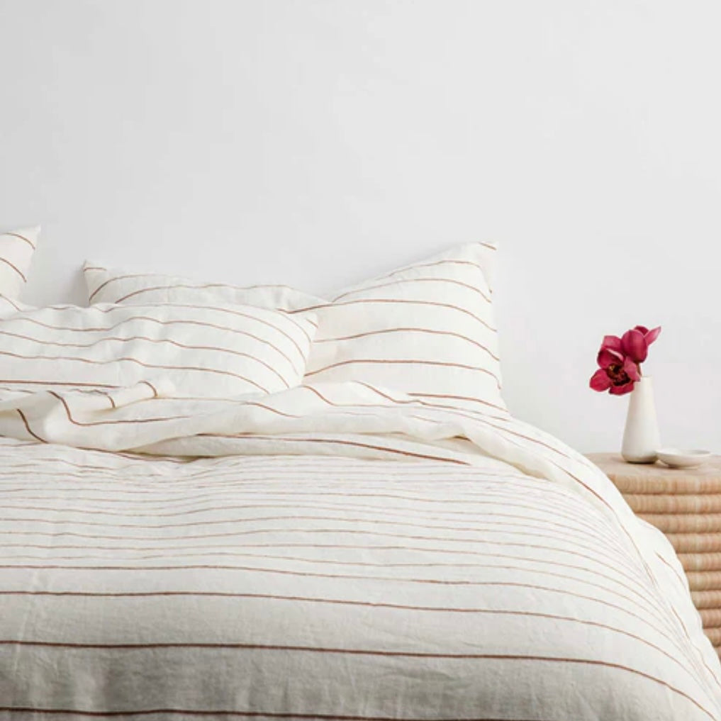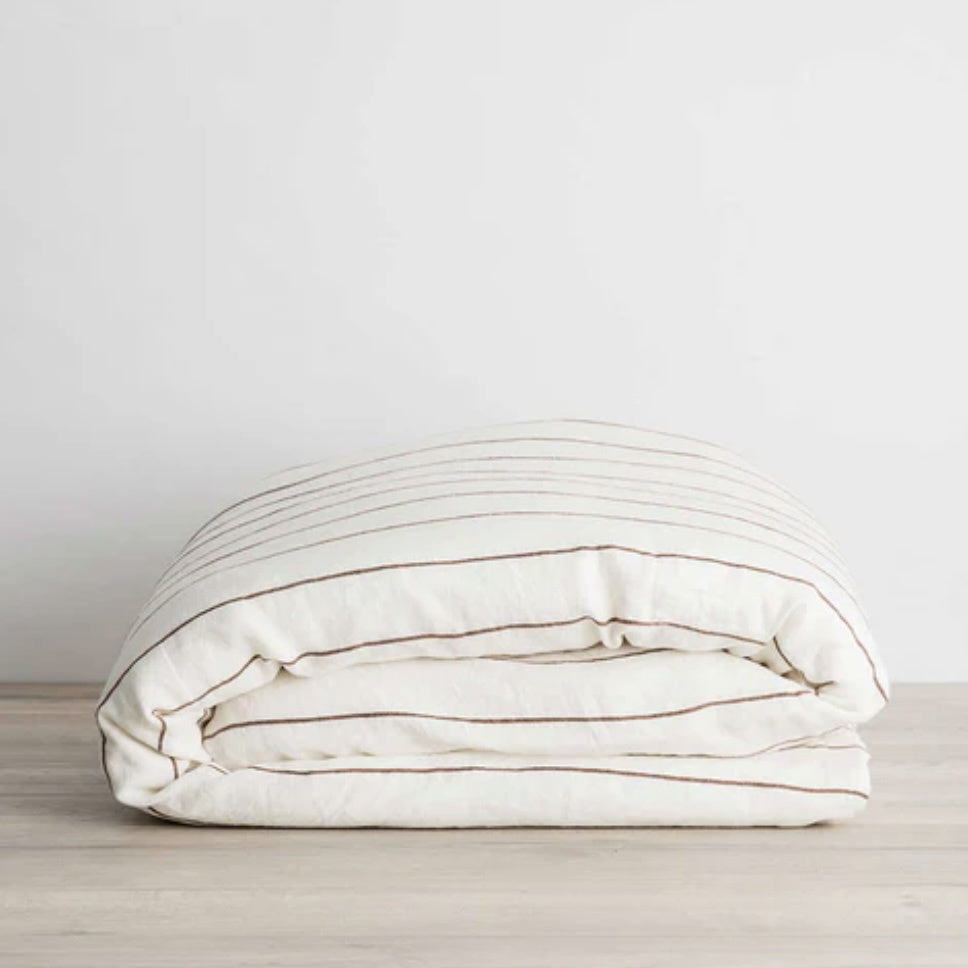 Cedar Stripe features a spaced, textured stripe woven in rich Cedar that runs across a soft off-white linen. Finished with a button closure and internal ties in each corner to secure your insert.