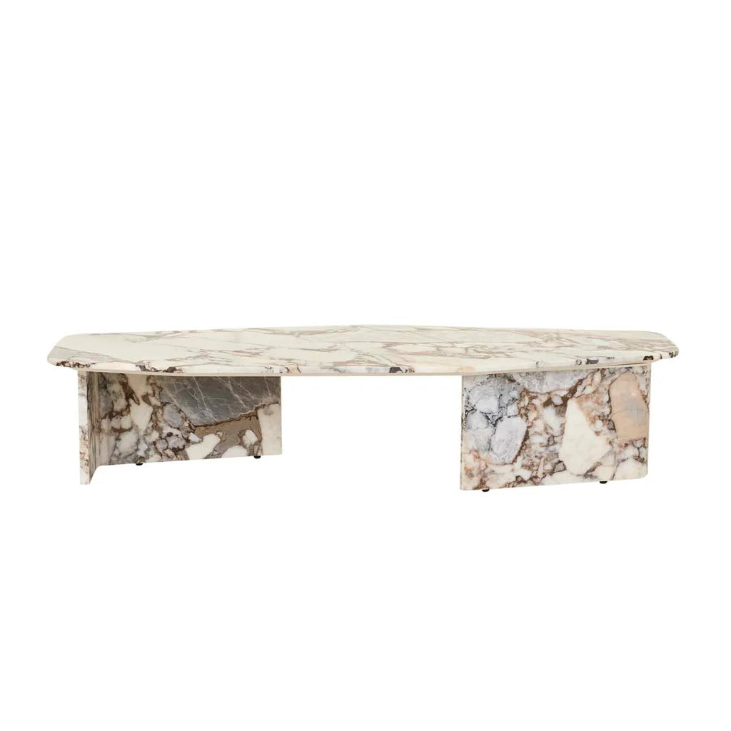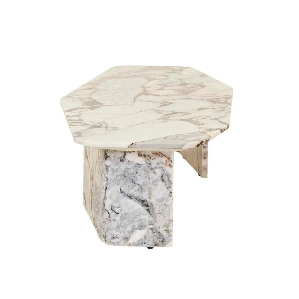 The Atlas Shift Coffee Table in Matt Ocean Marble embodies modern design with its angular and asymmetrical inspiration. Crafted for indoor use, it features a slim form and an irregular geometric shape softened by rounded edges. The marble top and legs, treated with a water based sealer, provide both elegance and durability. Its elongated shape allows for nesting with other tables or flexible use in various spaces. This table is perfect for adding a contemporary touch to your living area.