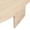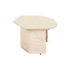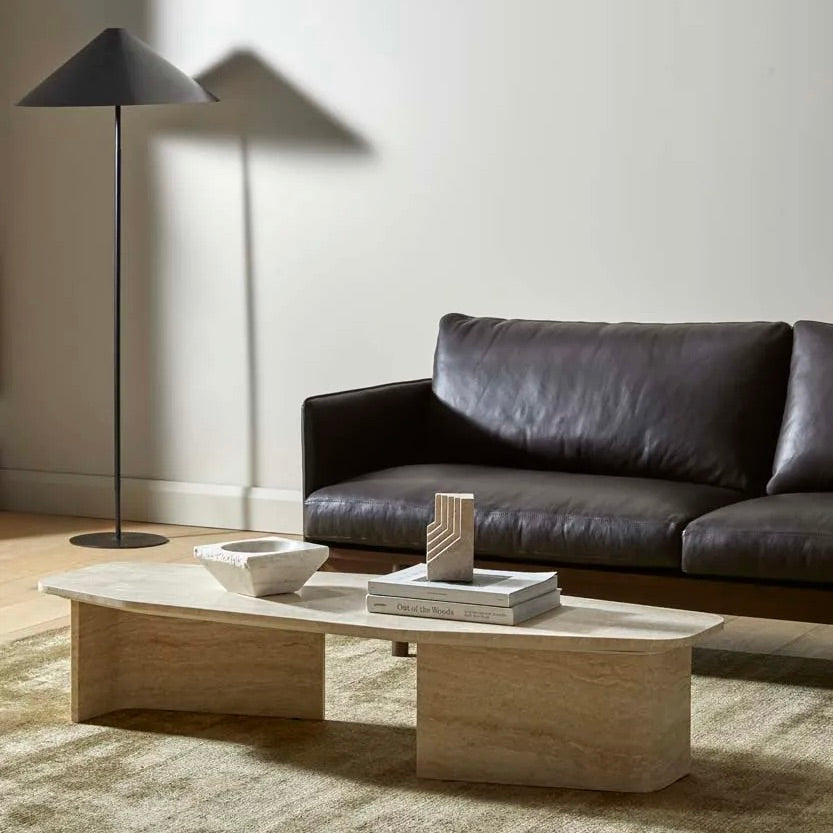 Experience modern elegance with the Atlas Shift Coffee Table in Natural Travertine. Designed for indoor use, featuring a slim form and an irregular geometric shape with softened edges. The marble top and legs, finished with a water based sealer, offer a blend of style and resilience. Its elongated shape is perfect for nesting with other tables or versatile placement in any room. This coffee table combines aesthetic appeal with practical functionality, enhancing the modern charm of your home.