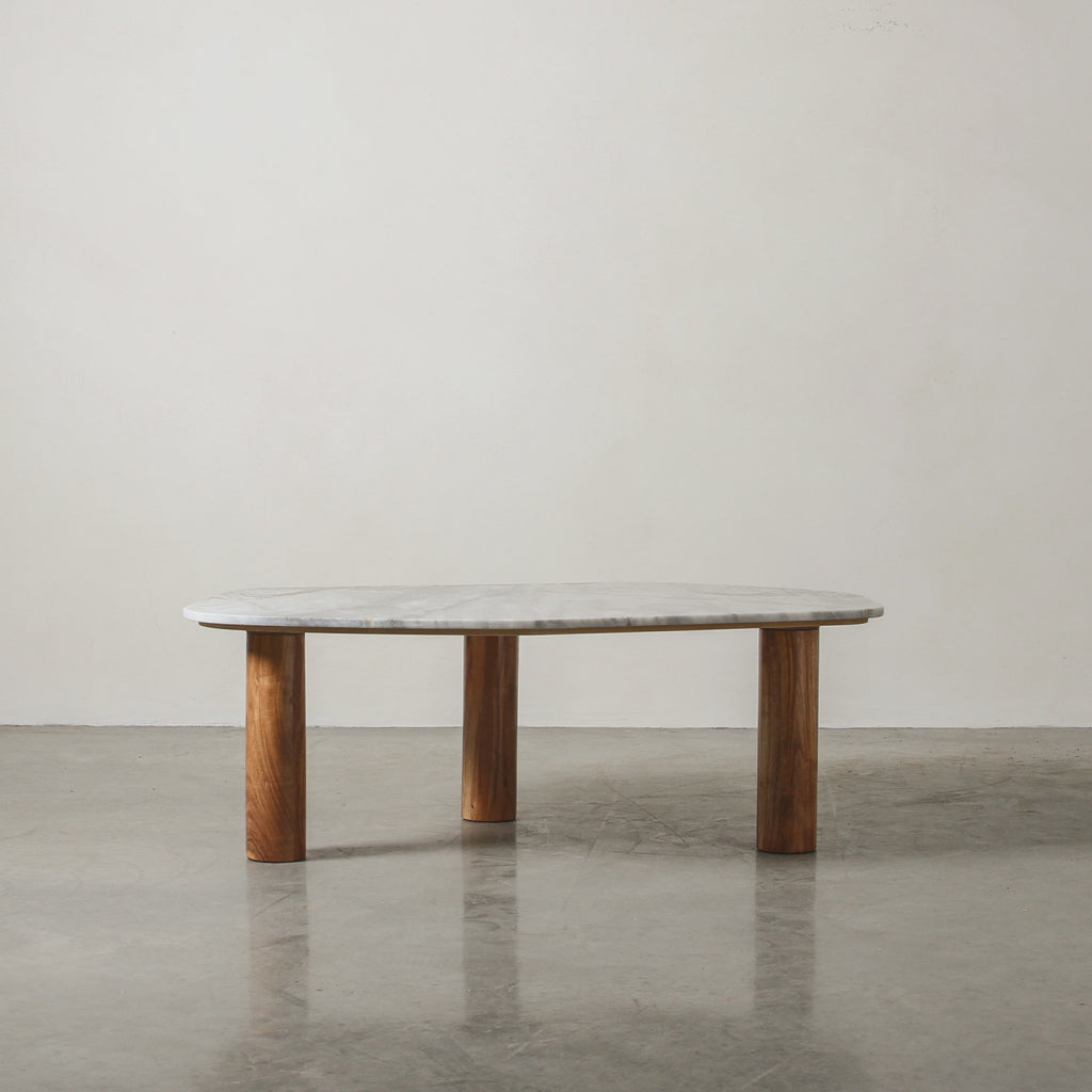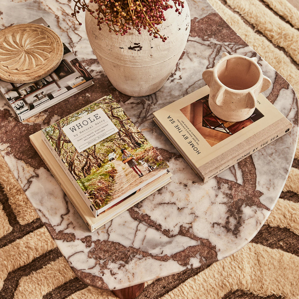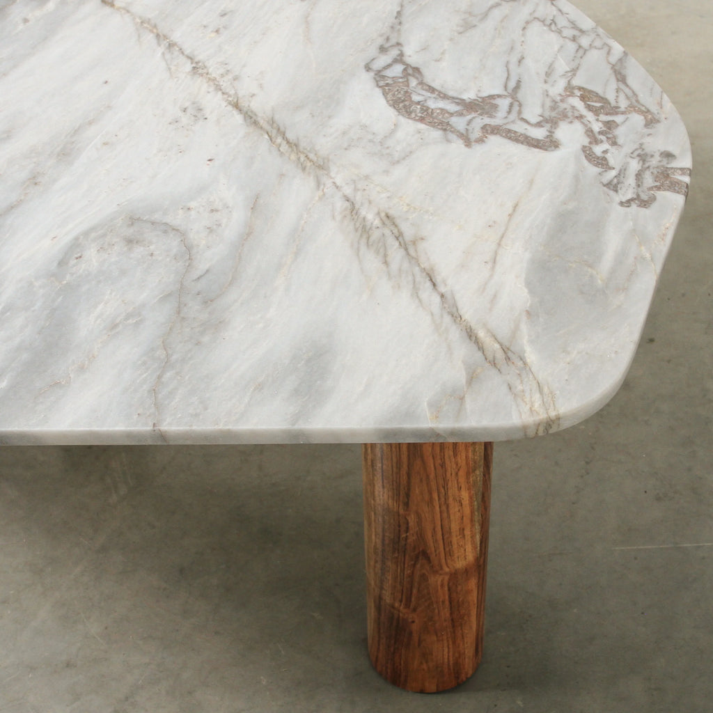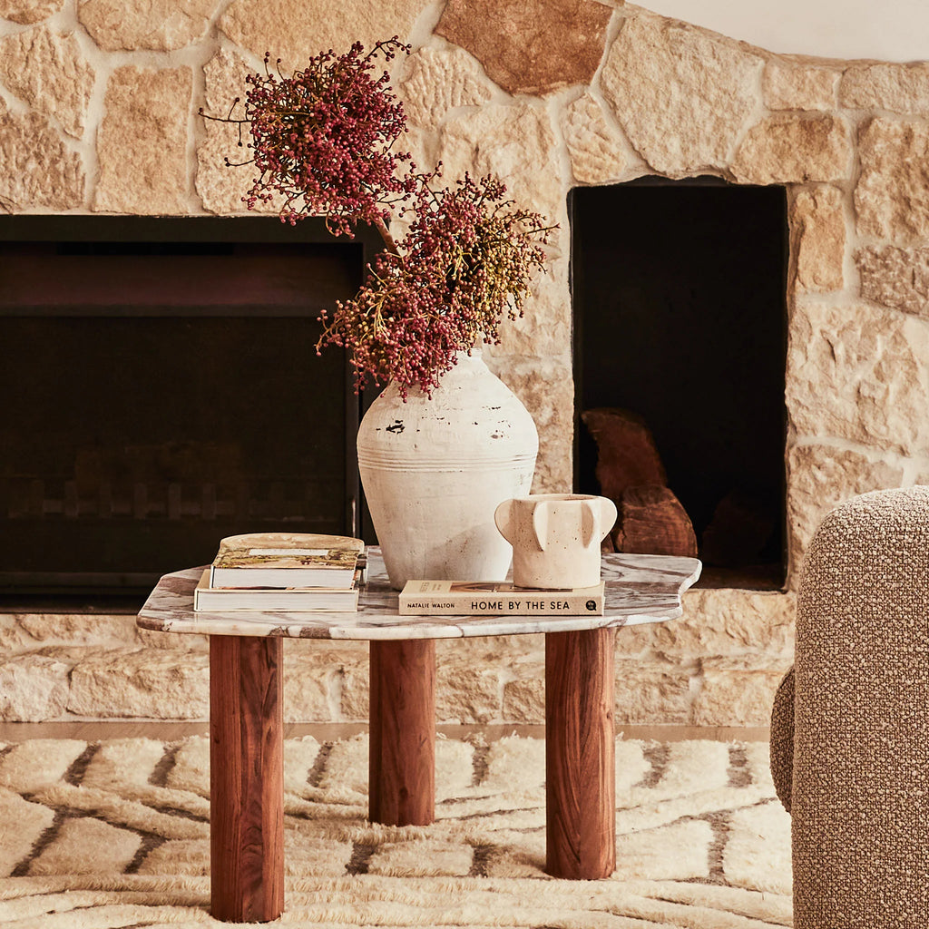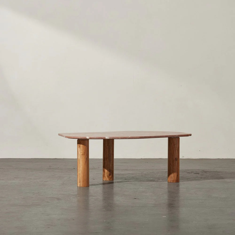 Indulge in the captivating allure of the Clifton Table, a marble top coffee table that exudes luxury and sophistication. Its unique irregular shape, characterized by organic smooth lines and a rounded rectangular silhouette, adds a touch of artistic charm to your living space. The Clifton Table stands on three column-shaped wooden legs, providing both stability and a visually intriguing design element. These warm coloured wooden legs perfectly complement the exquisite tones in the marble top, creating a harmonious fusion of materials and textures. Choose from four stunning tabletop finishes: red alicante, grey lagoon, pink lagoon and onyx travertine. Each option showcases its own distinctive beauty of the natural stone, allowing you to select the one that best complements your interior style and creates a captivating focal point in your space. The Clifton Table can be coupled with the slightly taller Waverly Table, creating a cohesive and stylish pairing that elevates your interior decor.