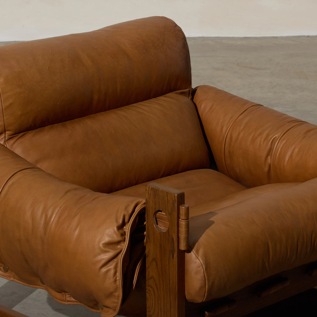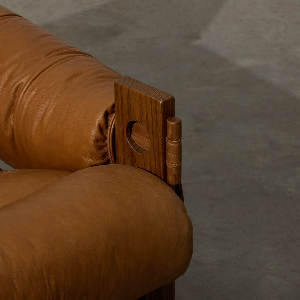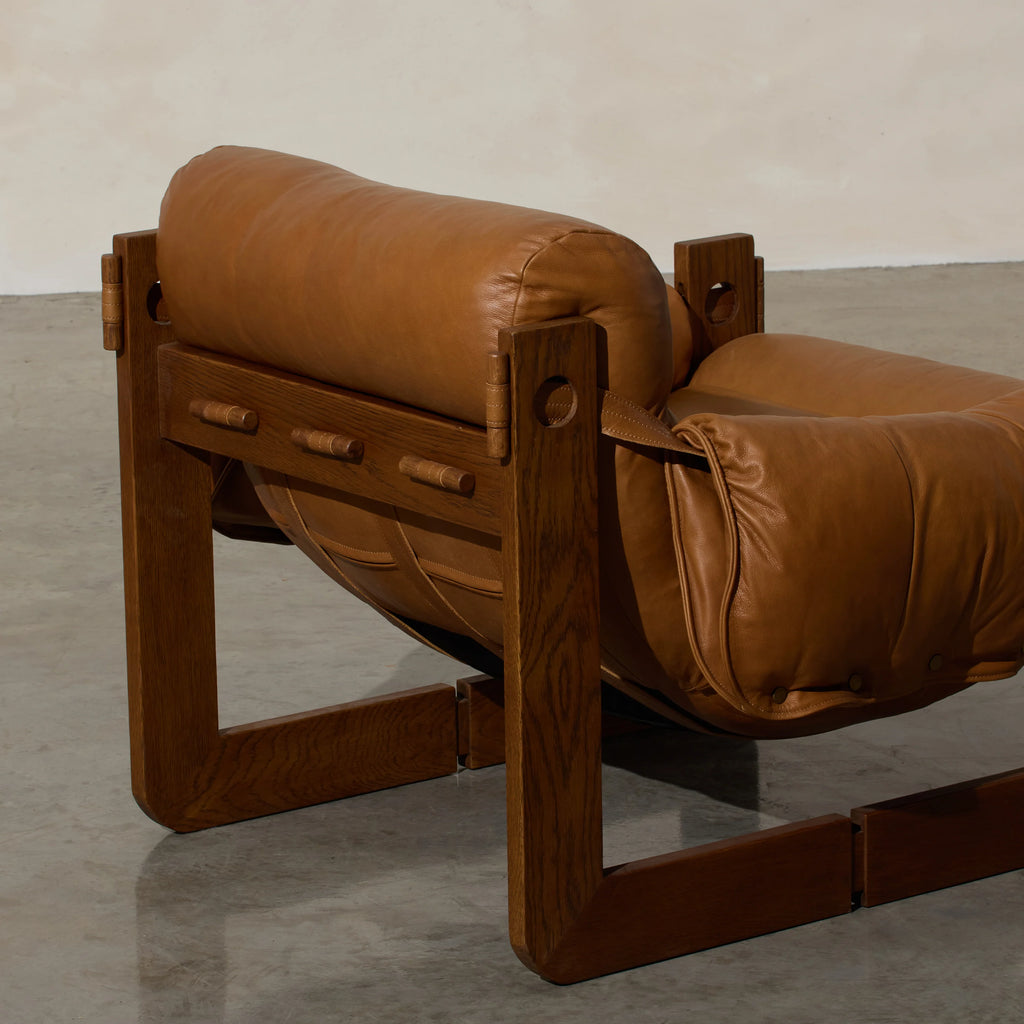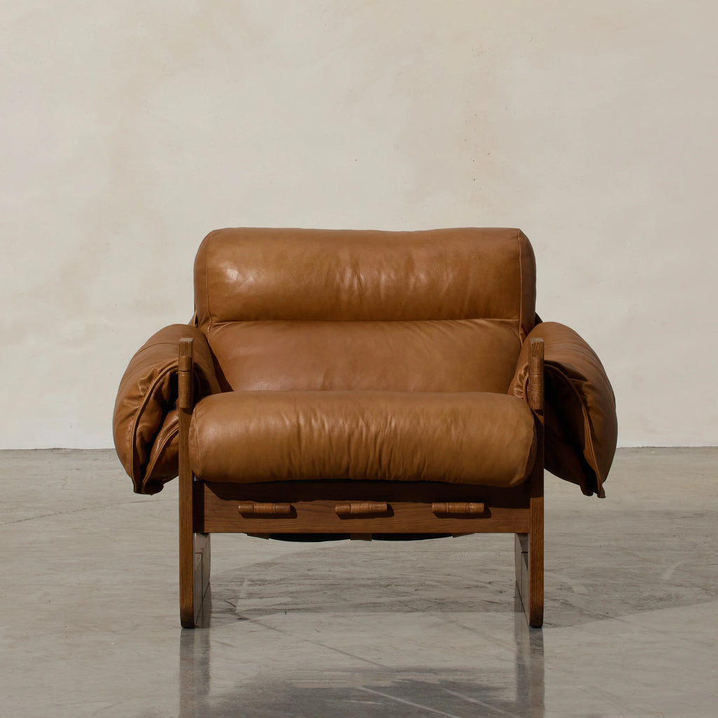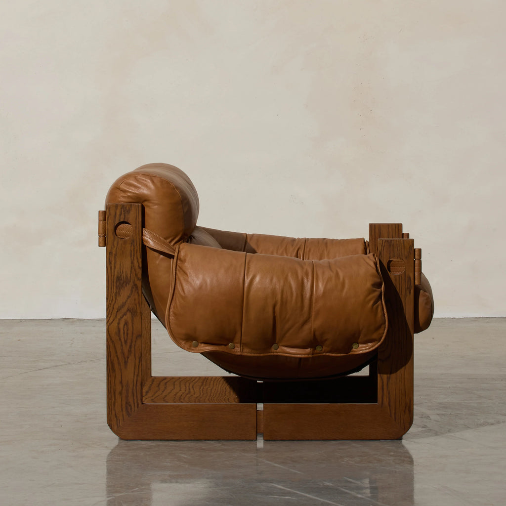 Henry is our Modernist-inspired occasional chair‚ a captivating blend of rugged grandeur and luxurious comfort. This distinctive chair features a robust form with tan leather upholstery that's as soft as it is stylish. The cushioned seating and backrest provide a plush retreat, inviting you to unwind in opulent relaxation. Crafted with exceptional attention to detail, the chair's brutalist form adds a touch of architectural intrigue, while the recycled oak tones bring warmth and sophistication. The marriage of soft cushioning and robust materials creates a harmonious balance between comfort and bold design. Stylist's tip: think about adding textured wall sculptures or abstract artwork that complements the chair's bold design.