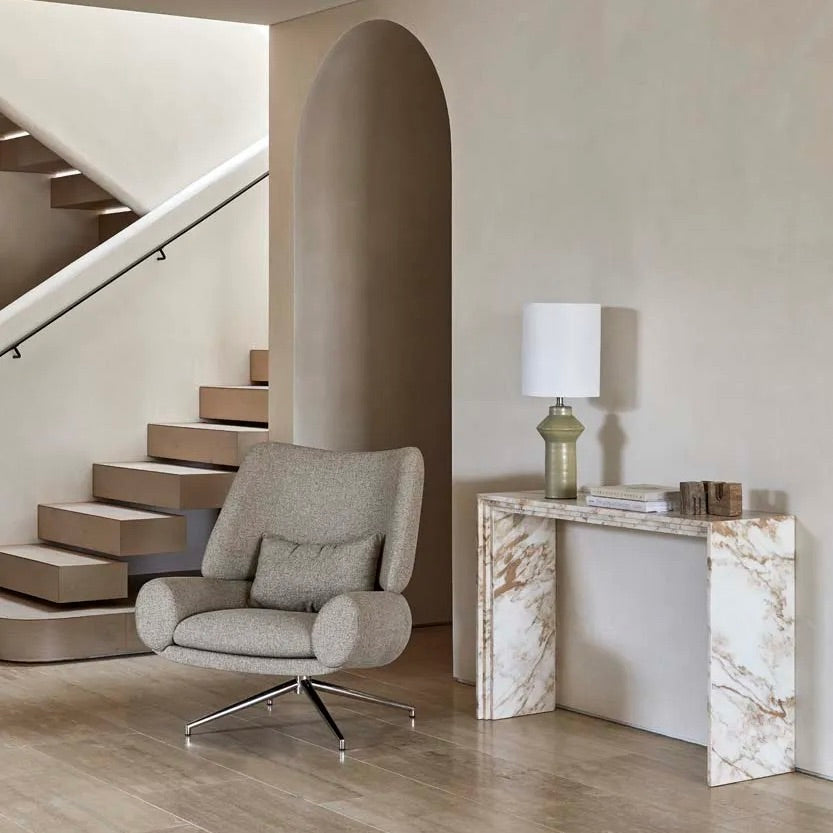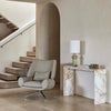 The Willa Marble Coffee Table in Grey Marble and Light Oak showcases a blend of contemporary style and versatility. Its elegant marble top combined with a light oak ellipse-shaped leg creates a stunning focal point in any living space, embodying modern design with its mixed materials and sophisticated aesthetic.