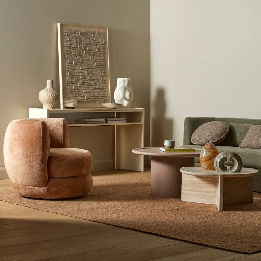 Sculptural elegance defines the Venus Revolve Coffee Table, where ocean marble forms graceful curves through refined geometry. Demi-bullnose detailing creates visual lightness, allowing marble surfaces to float within their base structure. Pure materiality speaks through softened edges, celebrating organic minimalism in contemporary spaces. Natural travertine introduces timeless luxury, delivering lasting appeal through balanced proportions suited for sophisticated living environments.