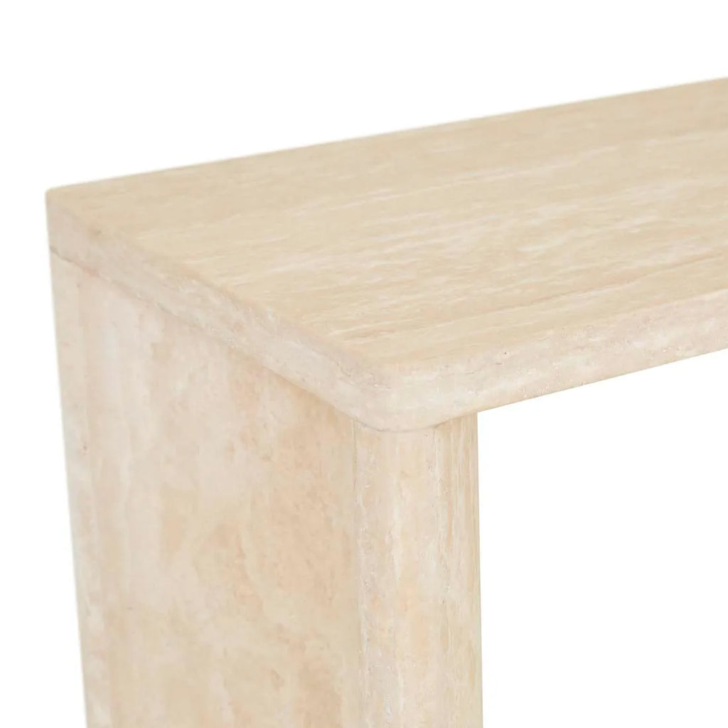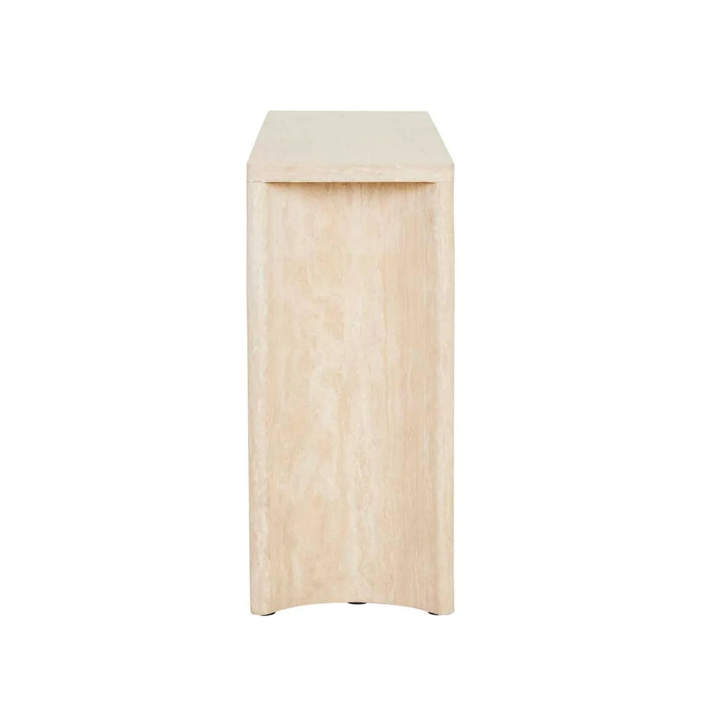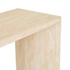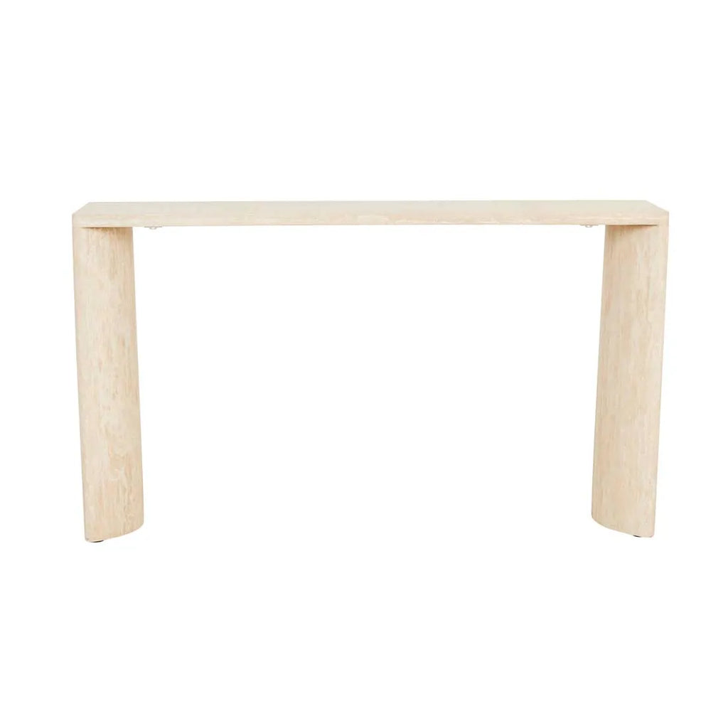 The Verity Console Table adds a touch of modern elegance to any interior. Featuring concave crescent legs and crafted from Natural Travertine, it provides a luxurious look. Ideal for contemporary living spaces, this console table combines style with practicality. Its high-quality construction ensures lasting beauty and functionality, designed for indoor and outdoor use.