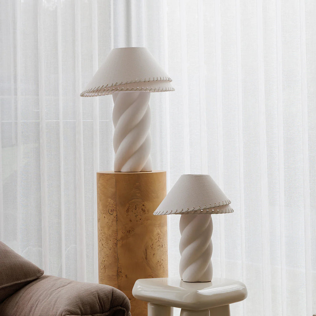 Illuminate your space with this beautifully crafted ivory statement lamp. Featuring a ceramic base with elegant, flowing curves that add warmth and natural texture to any room. The linen shade introduces a subtle, asymmetrical shape, lending a modern yet understated flair. Perfect for bedside tables or living room accents, it blends style and simplicity in one refined piece.