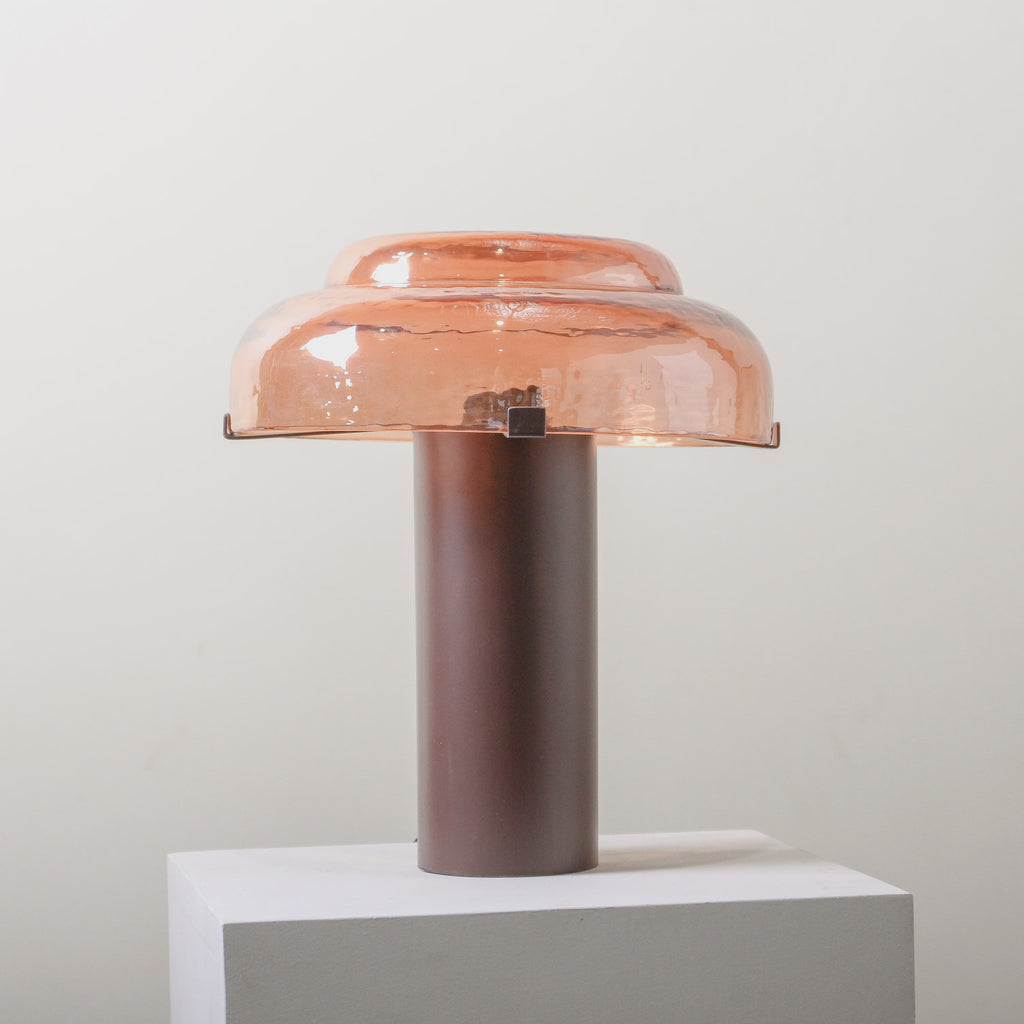 The Brunelle Lamp is a piece of quiet drama, where soft coral glass meets solid grounding. Its rippled glass shade evokes the movement of water or mist, diffusing light through shifting waves of colour. Resting on a cylindrical base in a rich, dark chocolate finish, its form feels considered and architectural - a balance of weight and lightness, opacity and glow. The base, with its deep tone anchors the piece, allowing the soft curves of the shade to shine. It's a lamp that brings depth to interiors, ideal for styling in a moody bedroom, a minimalist living room, or layered alongside stone, timber, or brushed metal for a rich material interplay. We brought Brunelle into the Tender Forms collection to introduce a darker, more grounded energy, to pair with our organic and metallic pieces, and to offer a sculptural silhouette with presence and soul.