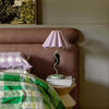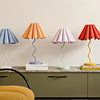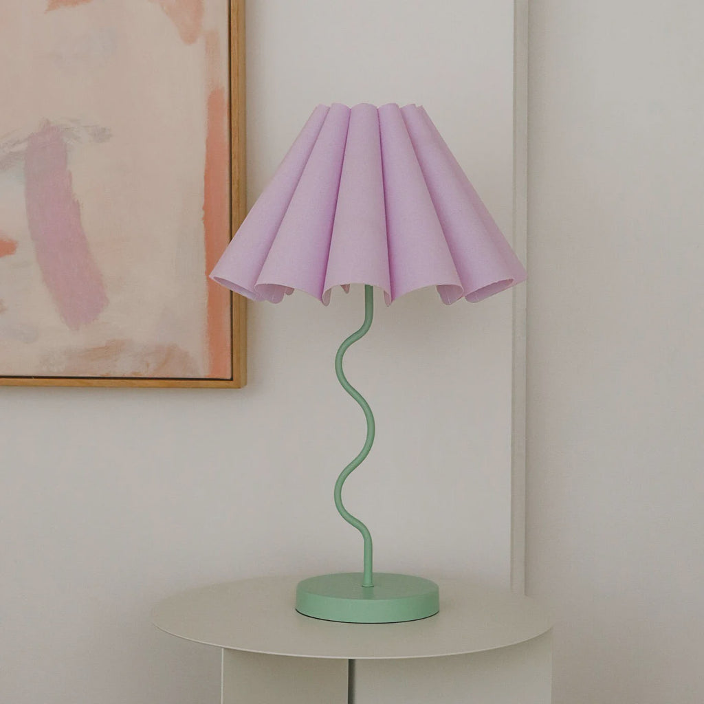 Introducing our new vintage-style lamp, the perfect addition to any home decor. With a soft lilac fluted lampshade and a pastel green matte squiggly metal base, this lamp will add a touch of elegance to your space.