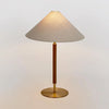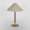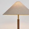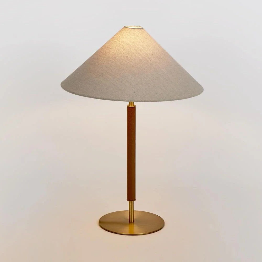 The Hunter Table Lamp exudes elegance with its brushed warm brass finish and leather-look wrap. It features a stylish tapered linen lampshade that complements its sophisticated design. This lamp combines luxurious materials and a timeless aesthetic, making it a statement piece for any room.