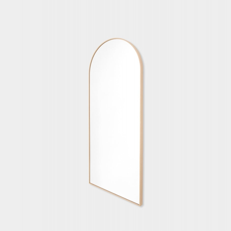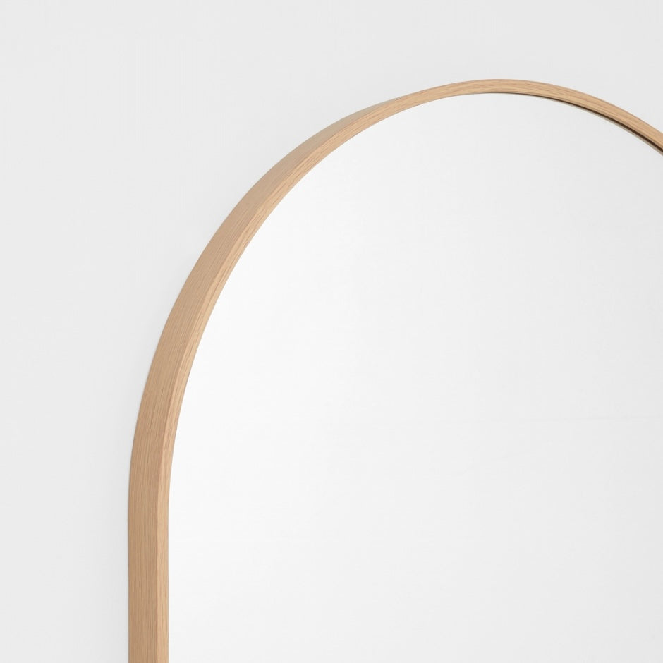 This mirror features a slim metal frame, finished with a light oak-look synthetic wrap. This modern timber-inspired colourway is endlessly versatile, complimenting both bright and neutral colour schemes.