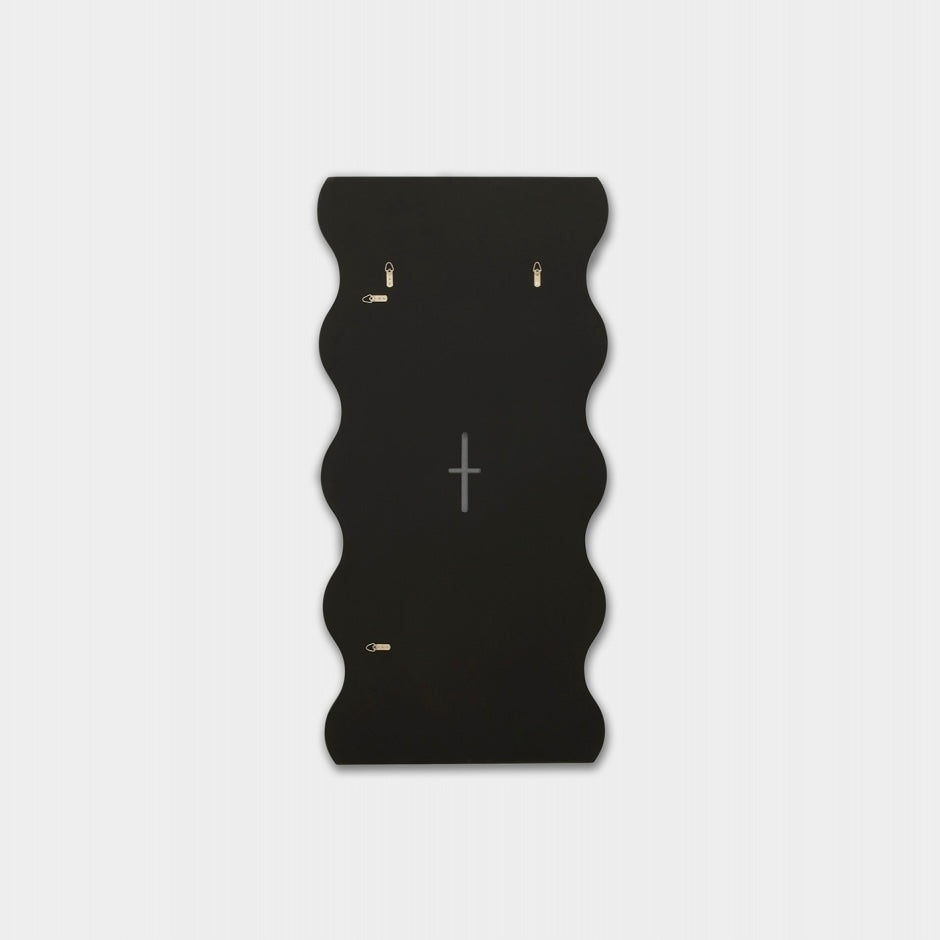 Mirrored glass, painted engineered wood frame, engineered wood backing.