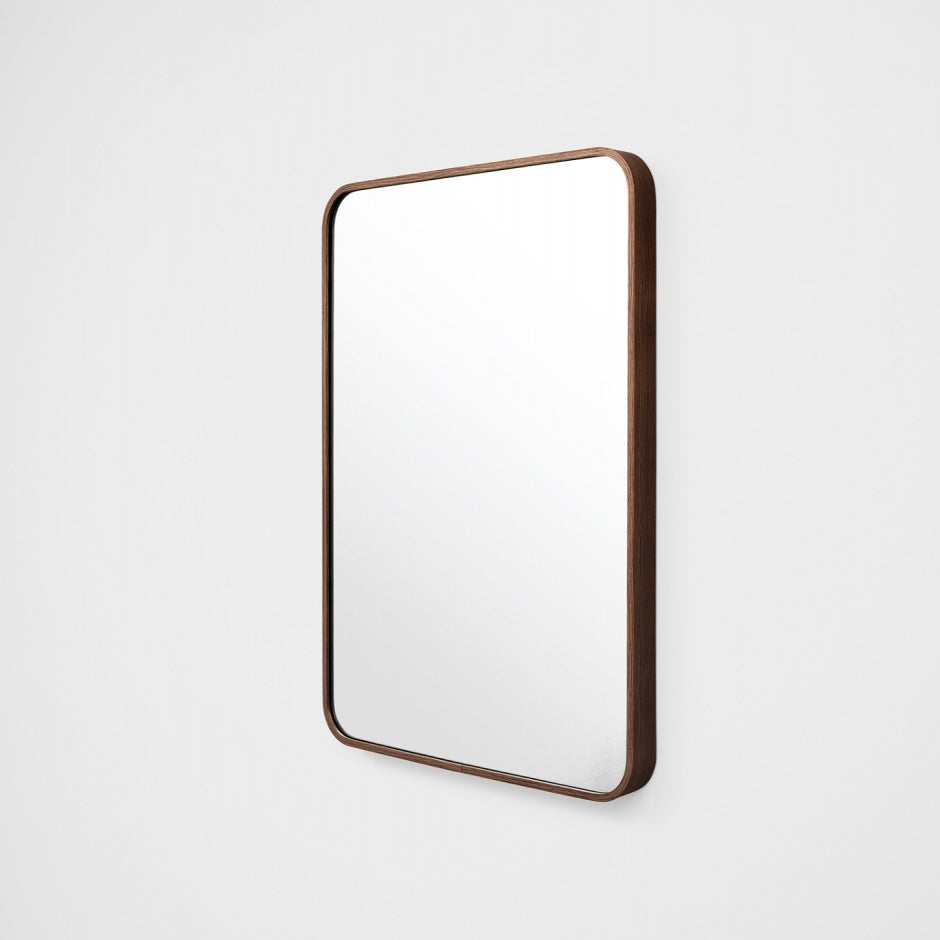 This mirror features a slim metal frame with curved corners and a simple join at the side of the mirror.