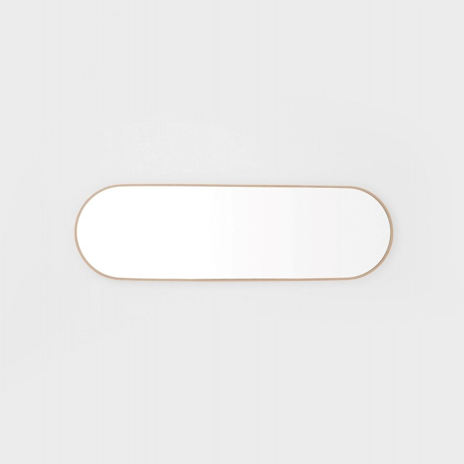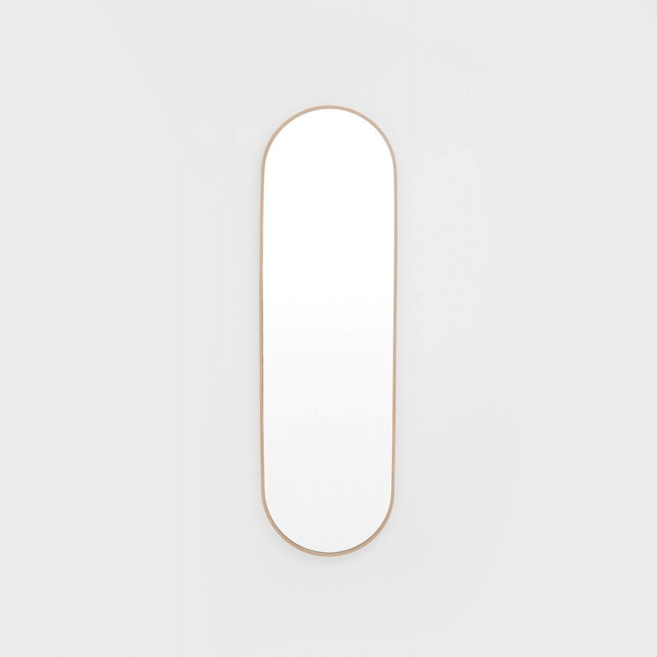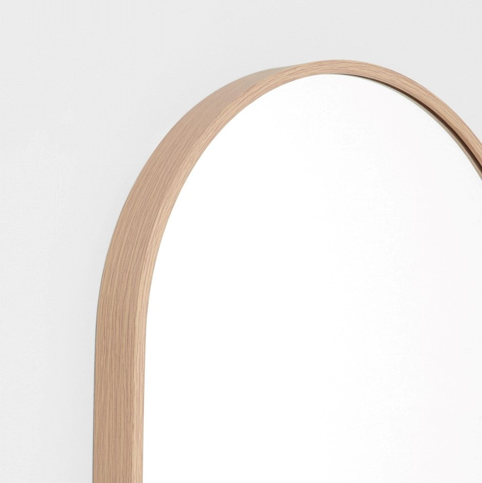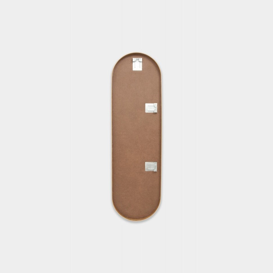 This piece features a slim metal frame, finished with a light oak-look synthetic wrap with a simple join at the base of the mirror. This modern timber-inspired colourway is endlessly versatile, complimenting both bright and neutral colour schemes.
