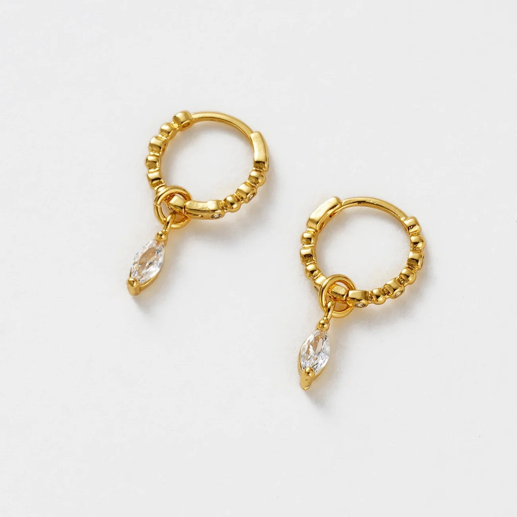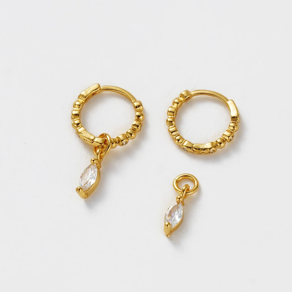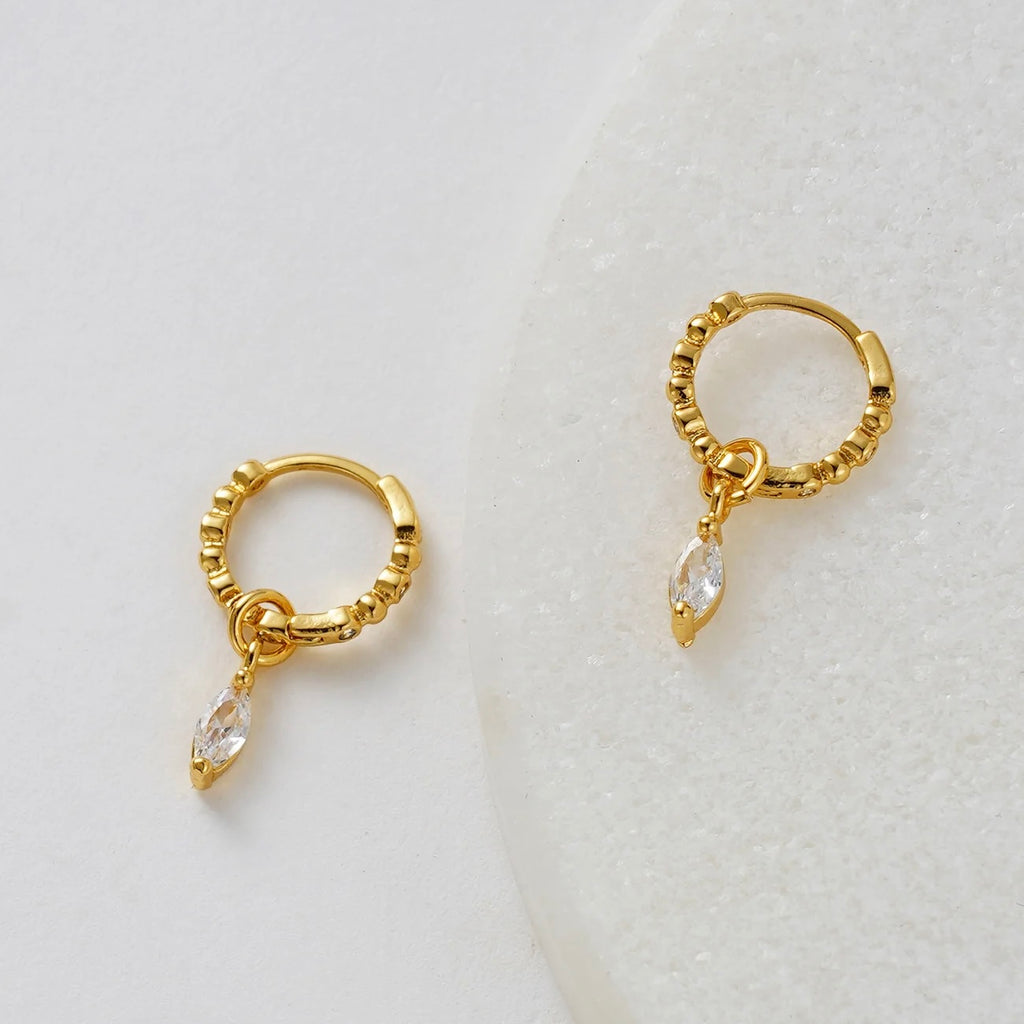The Bridie Huggie is a delicate balance of texture and sparkle. Designed with a beaded gold hoop and finished with a marquise-cut crystal drop, this style adds effortless elegance to any look. Perfect for day-to-night wear, the Bridie Huggie can be worn solo as a statement or layered into your everyday stack for a touch of refined detail.