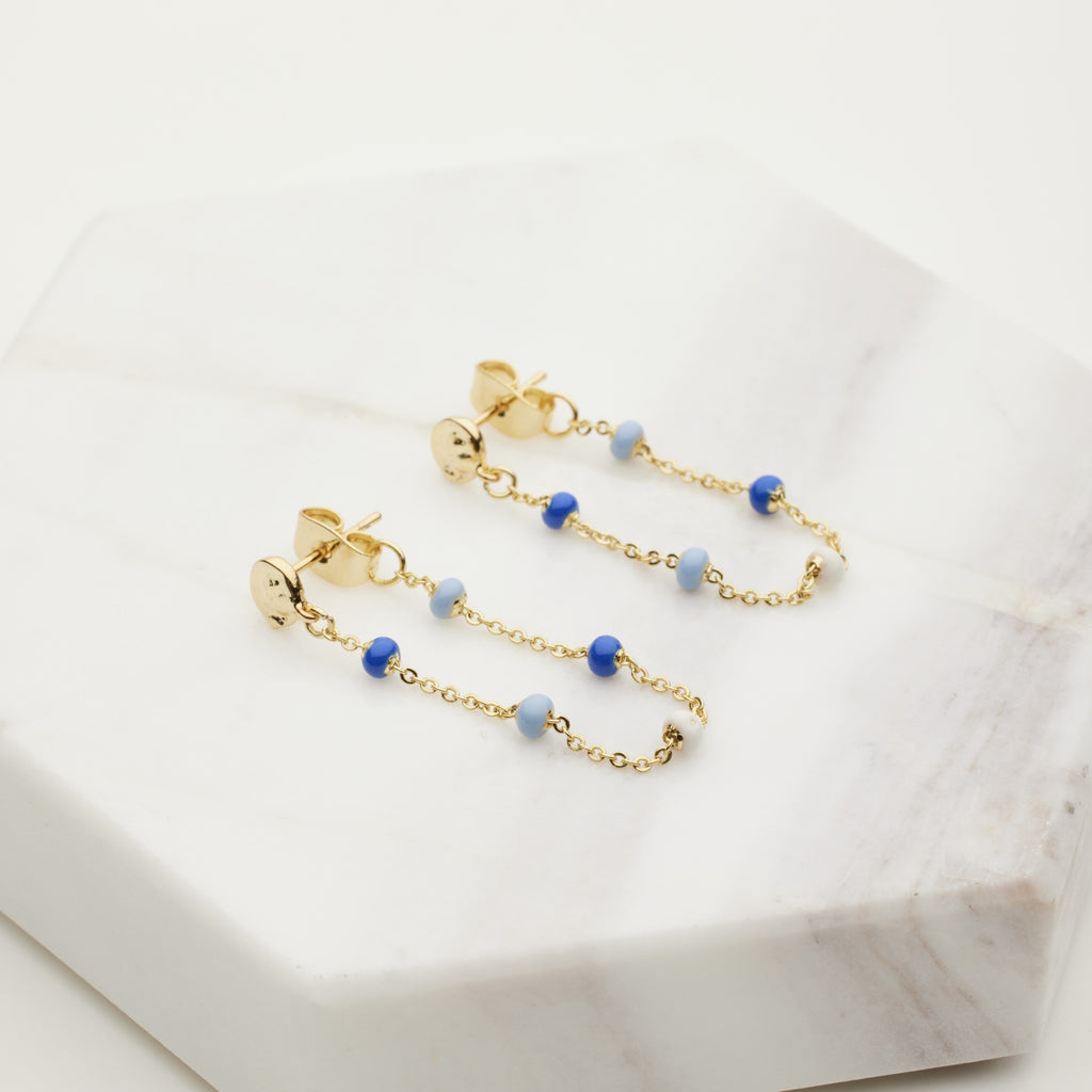 The Charlotte Earring in gold and blue enamel is a delicate drop design with a fun pop of colour.