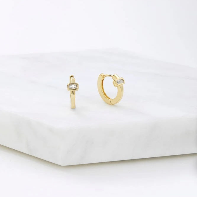 The Elsie Huggie is a petite and elegant hoop, featuring a stunning baguette-cut crystal at its center for a refined sparkle. Designed for effortless everyday wear, this delicate huggie is perfect for stacking or wearing solo as a subtle statement.