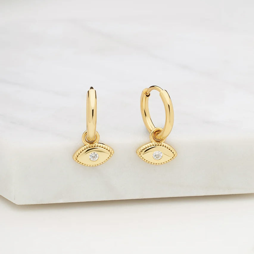 The Evil Eye Earring is a huggie hoop featuring a delicate evil eye drop, symbolising protection and positivity. Designed for effortless everyday wear, this meaningful piece adds a subtle yet stylish touch to any look.